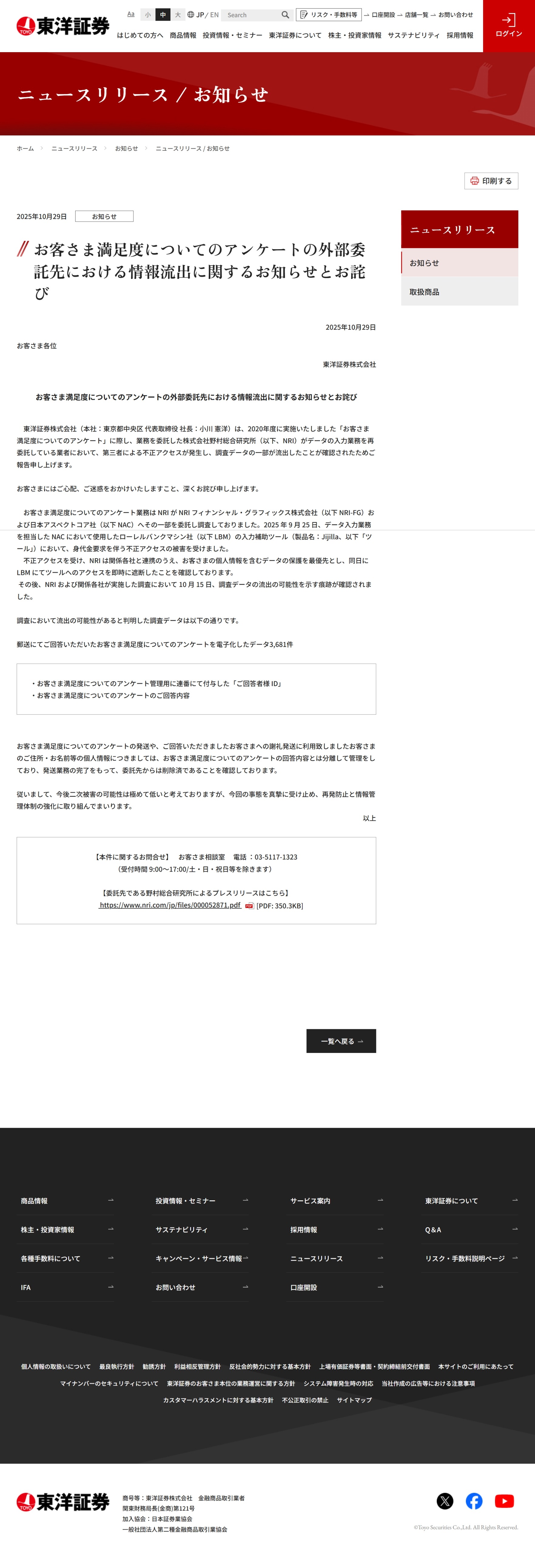 お客さま満足度についてのアンケートの外部委託先における情報流出に関するお知らせとお詫び | お知らせ | 東洋証券株式会社