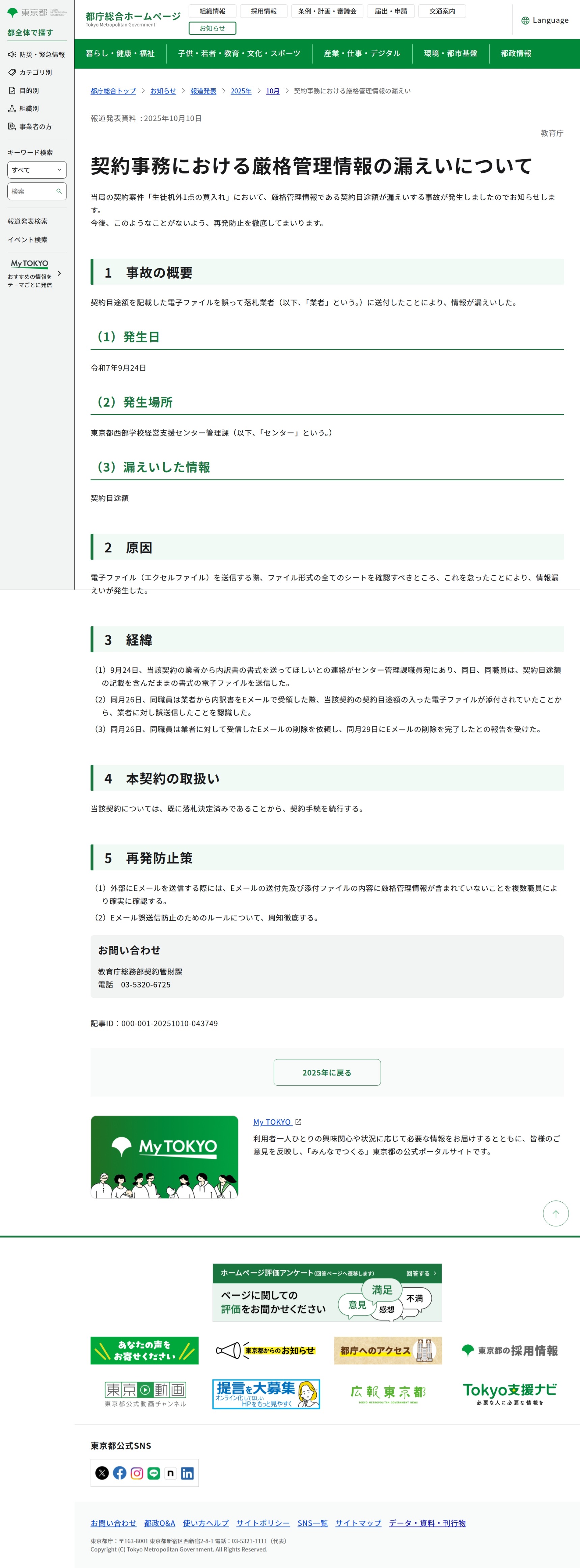 契約事務における厳格管理情報の漏えい|10月|都庁総合ホームページ事案の概要:東京都教育庁は、令和7年9月24日に西部学校経営支援センター管理課において、契約事務に関する厳格管理情報である契約目途額を誤って落札業者に送付し、情報漏えいが発生したと発表しました。これは、契約案件「生徒机外1点の買入れ」に関する電子ファイルの送信時に、全シートの内容確認を怠ったことが原因で、職員は誤送信に気づいた後、業者に対してメールの削除を依頼し、9月29日に削除が完了したとの報告を受けたとしています。契約手続きは落札決定済みのため継続され、再発防止策として、複数職員による確認体制の強化や誤送信防止ルールの周知徹底が図られる予定です。