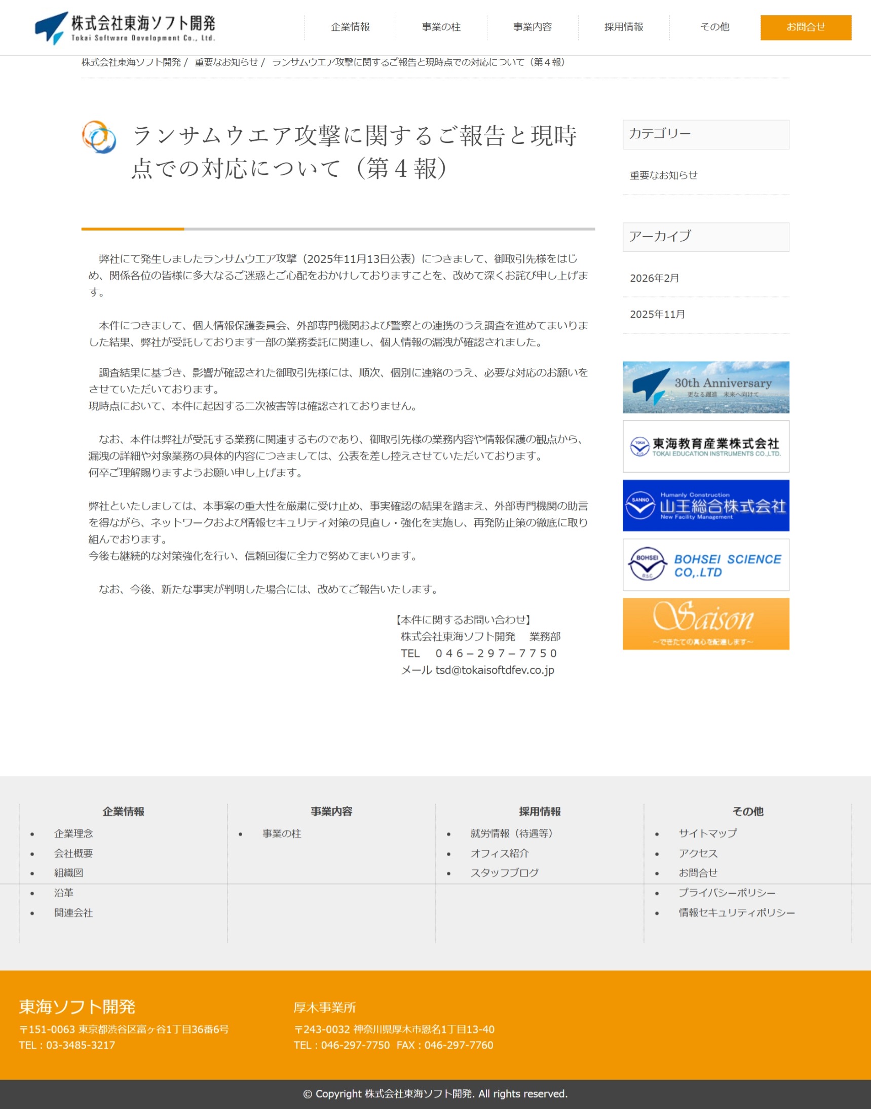 11月25日(火) ランサムウエア攻撃に関するお知らせとお詫び(第3報)