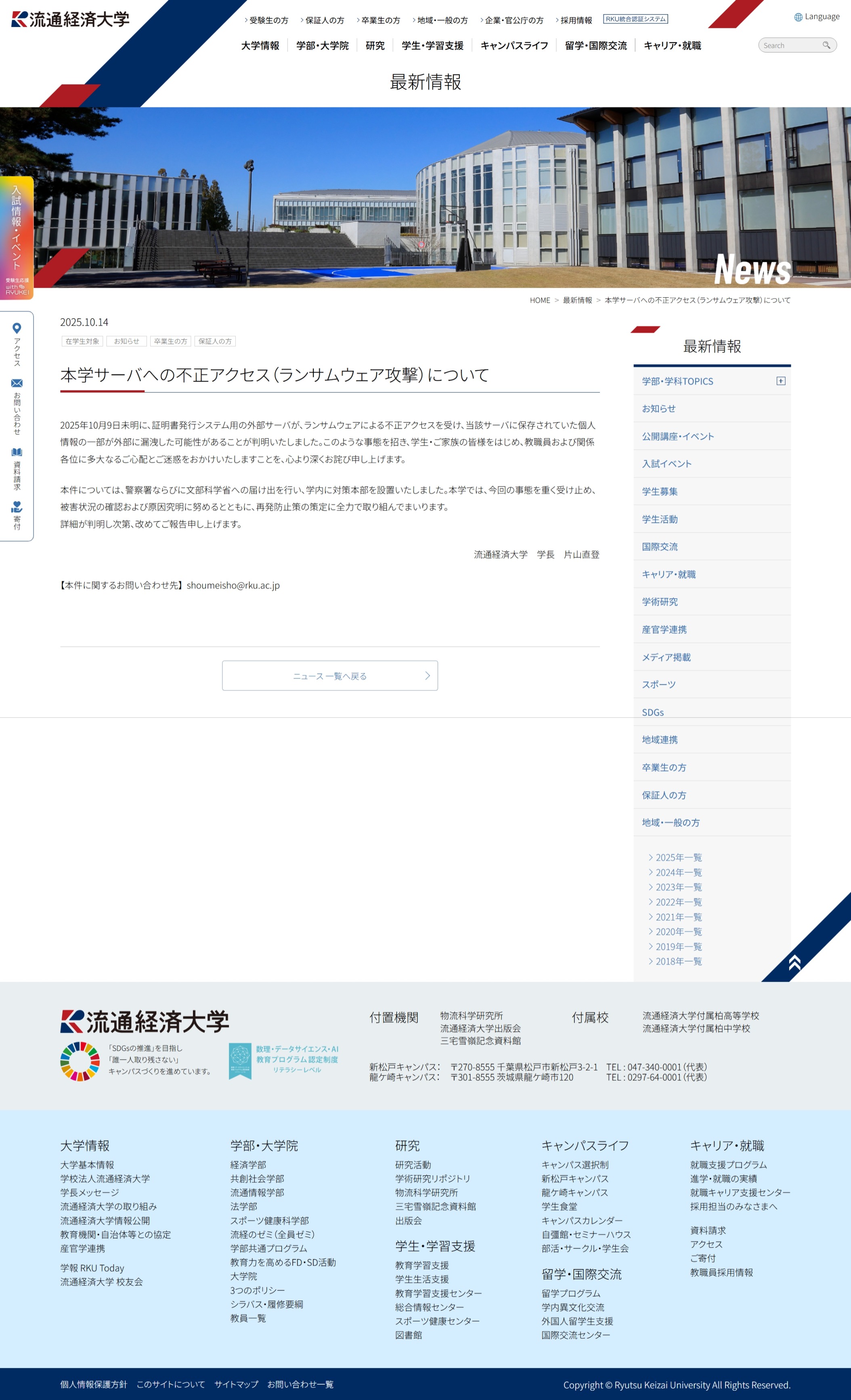 本学サーバへの不正アクセス(ランサムウェア攻撃)について | 流通経済大学事案の概要:流通経済大学は2025年10月14日、証明書発行システム用の外部サーバがランサムウェアによる不正アクセスを受け、保存されていた一部の個人情報が外部に漏洩した可能性があることを明らかにしました。大学はこの事態を受け、警察署および文部科学省への届け出を行うとともに、学内に対策本部を設置し、被害状況の確認と原因究明、再発防止策の策定に取り組んでいます。学生や関係者に多大な心配と迷惑をかけたことに対し、大学側は深く謝罪しており、詳細が判明次第、改めて報告する方針です。