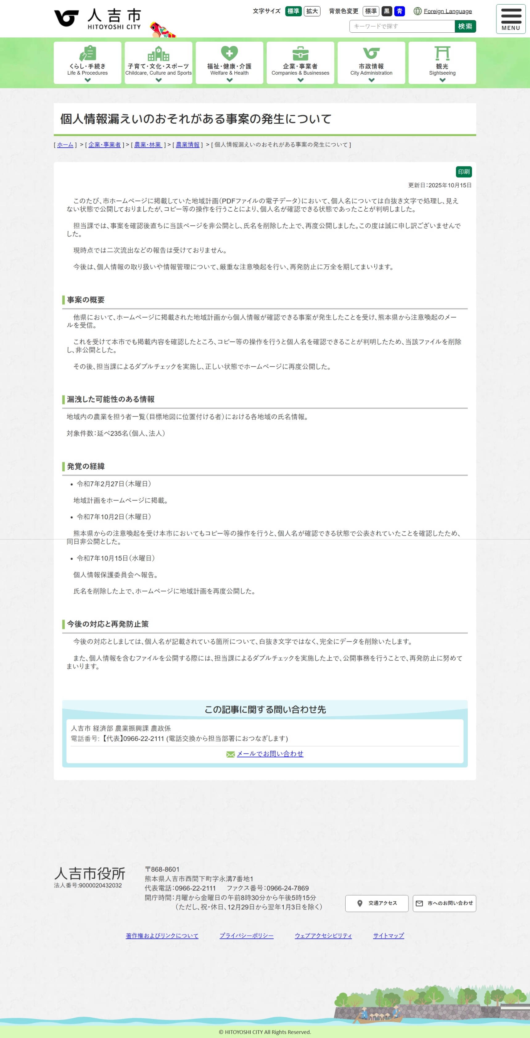 個人情報漏えいのおそれがある事案の発生について / 人吉市事案の概要:人吉市は、ホームページ上に掲載していた地域計画のPDFファイルにおいて、白抜き文字で処理したはずの個人名が、コピーなどの操作によって確認できる状態で公開されていたことが判明したと発表しました。対象となったのは、地域内の農業を担う者一覧に記載された延べ235名(個人・法人)の氏名情報で、熊本県からの注意喚起を受けて確認した結果、令和7年10月2日に該当ファイルを非公開とし、氏名を削除した上で再公開したとのことです。現時点で二次流出の報告はなく、今後は白抜き処理ではなく完全なデータ削除を行うとともに、担当課によるダブルチェックを徹底することで再発防止に努めるとしています。
