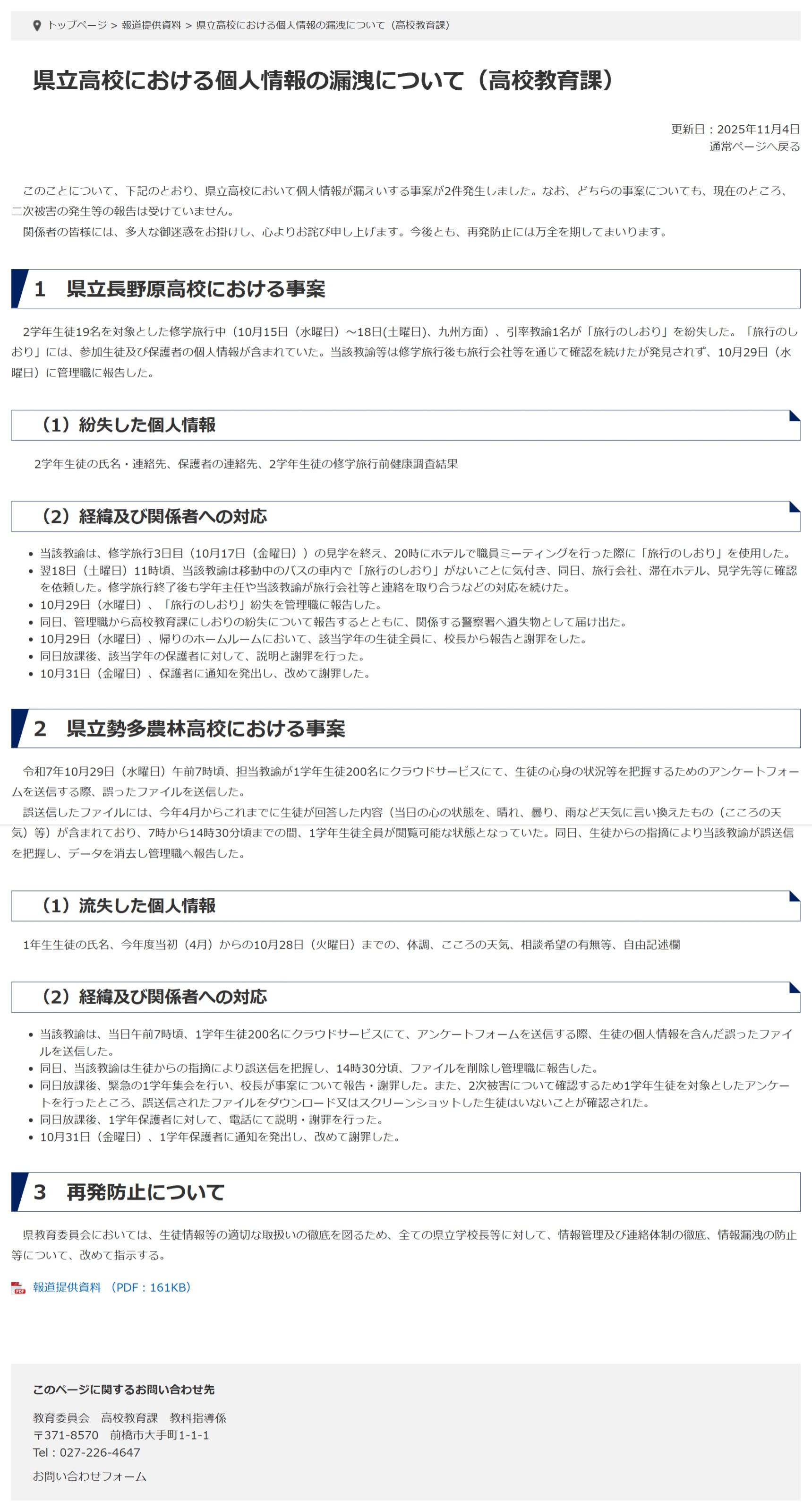 群馬県は、県立高校2校(長野原高校、勢多農林高校)で個人情報が漏えいする事案が2件発生したと発表しました。