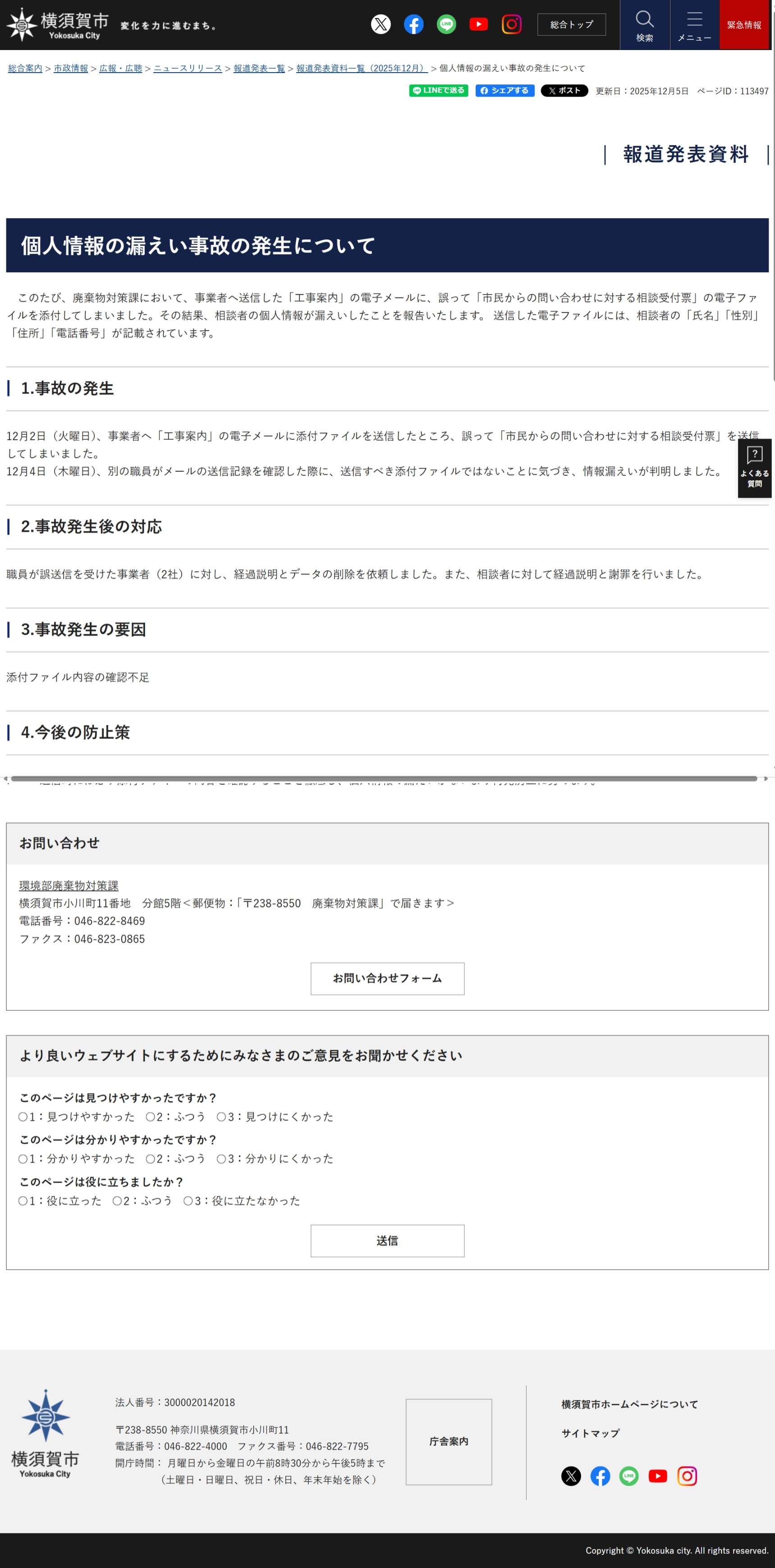 横須賀市は2025年12月5日、廃棄物対策課において個人情報の漏えいがあったと発表しました。同市によると、12月2日に職員が事業者へ工事案内のメールを送信した際、誤って市民の相談内容や連絡先が記載された「相談受付票」を添付してしまったとのことです。後日、別の職員が送信記録を確認した際にミスが発覚しました。市は誤送信先の事業者にデータの削除を依頼するとともに、被害を受けた市民に対して謝罪を行いました。
