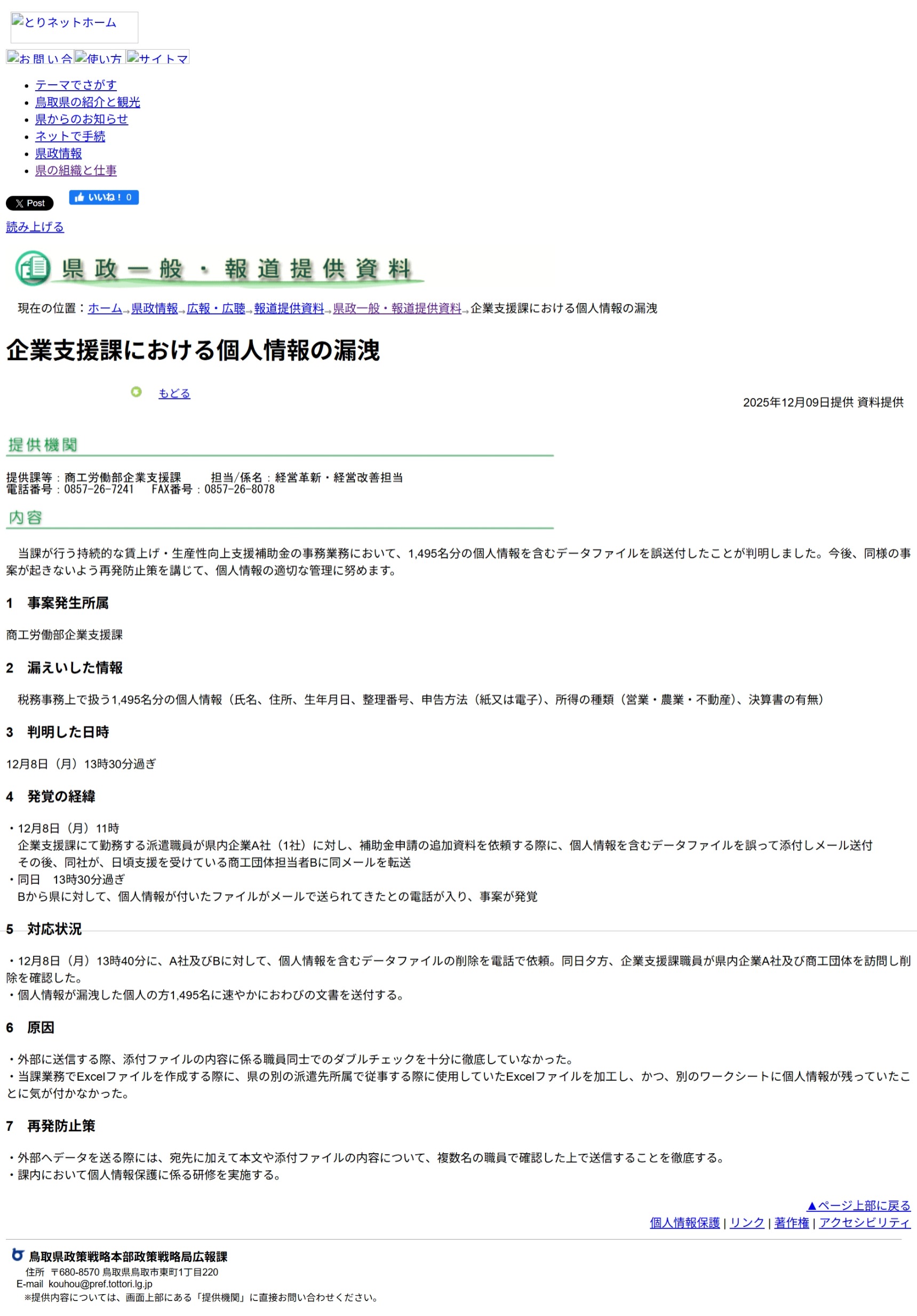 鳥取県は12月9日、商工労働部企業支援課の職員が、県内の企業に対して補助金事務に関するメールを送信した際、無関係な個人情報が含まれたファイルを誤って添付したと発表しました。この誤送信により、1,495人分の氏名、住所、生年月日、所得情報などが流出しました。受信した企業からの指摘を受けて事態が判明し、県は情報の削除確認と対象者への謝罪を進めています。