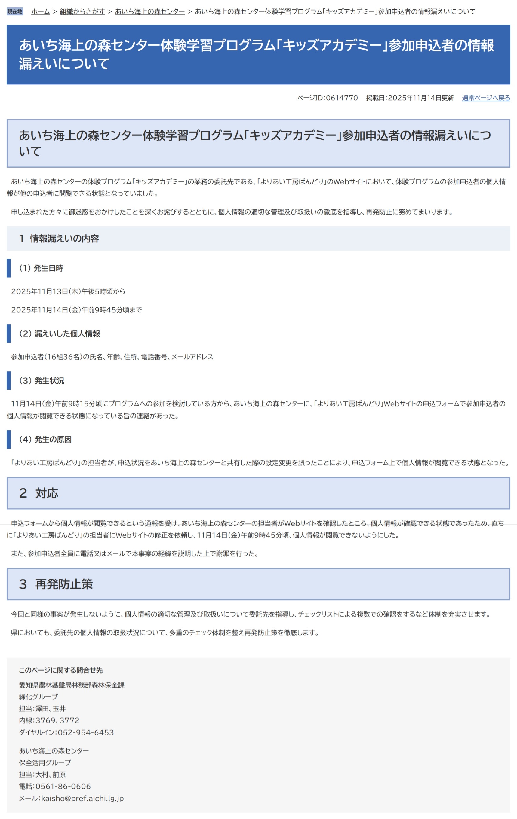 愛知県では、「あいちキッズ・アカデミー」に関連する事業において個人情報が漏洩する事案が発生しました。これは、業務委託先が管理するシステムの不適切な設定が原因とみられ、特定の操作によって申込者の個人情報が外部から閲覧可能な状態となっていたものです。