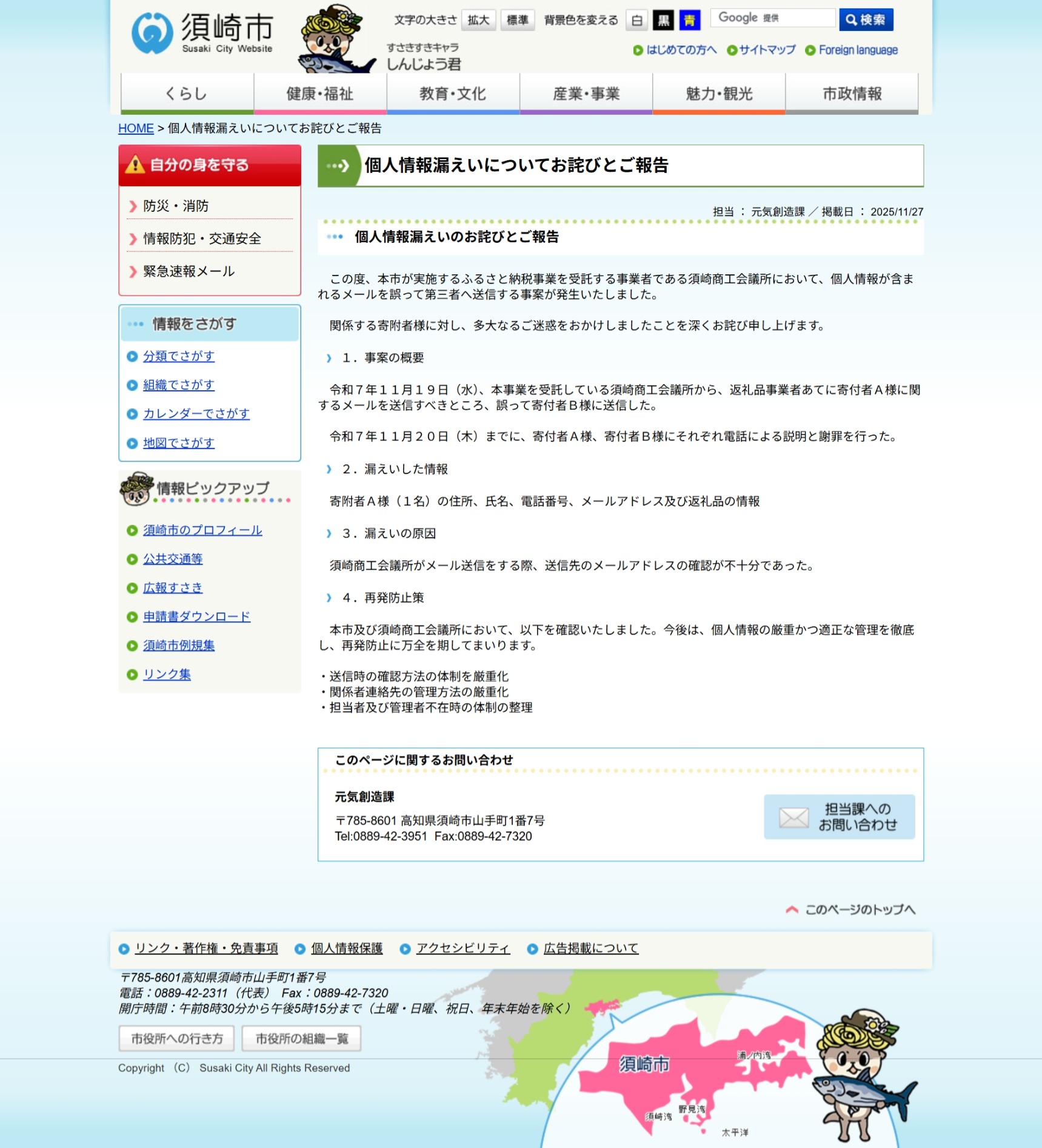 高知県須崎市では、市職員が業務上取り扱う個人情報が含まれた書類を紛失したとの報告がなされました。