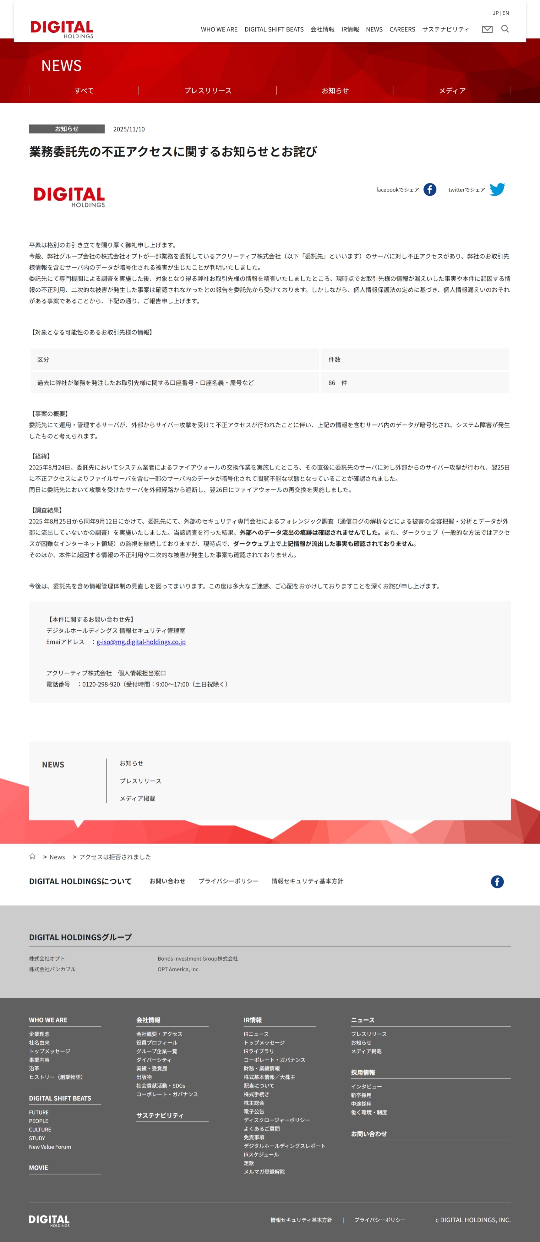 業務委託先の不正アクセスに関するお知らせとお詫び | News | デジタルホールディングス