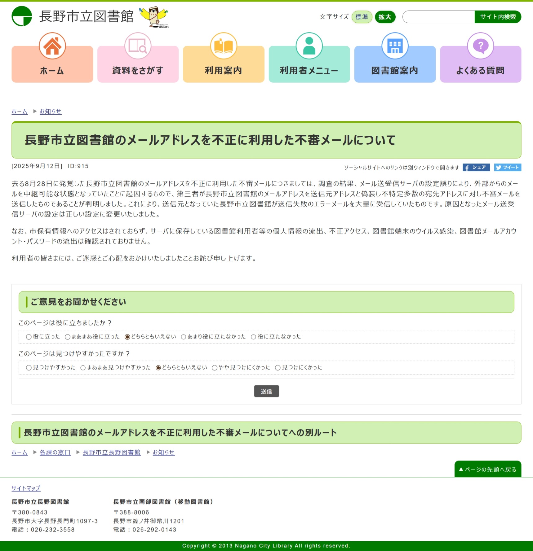 8月31日 【注意喚起】長野市立図書館のメールアドレスを利用した不審メールにご注意ください