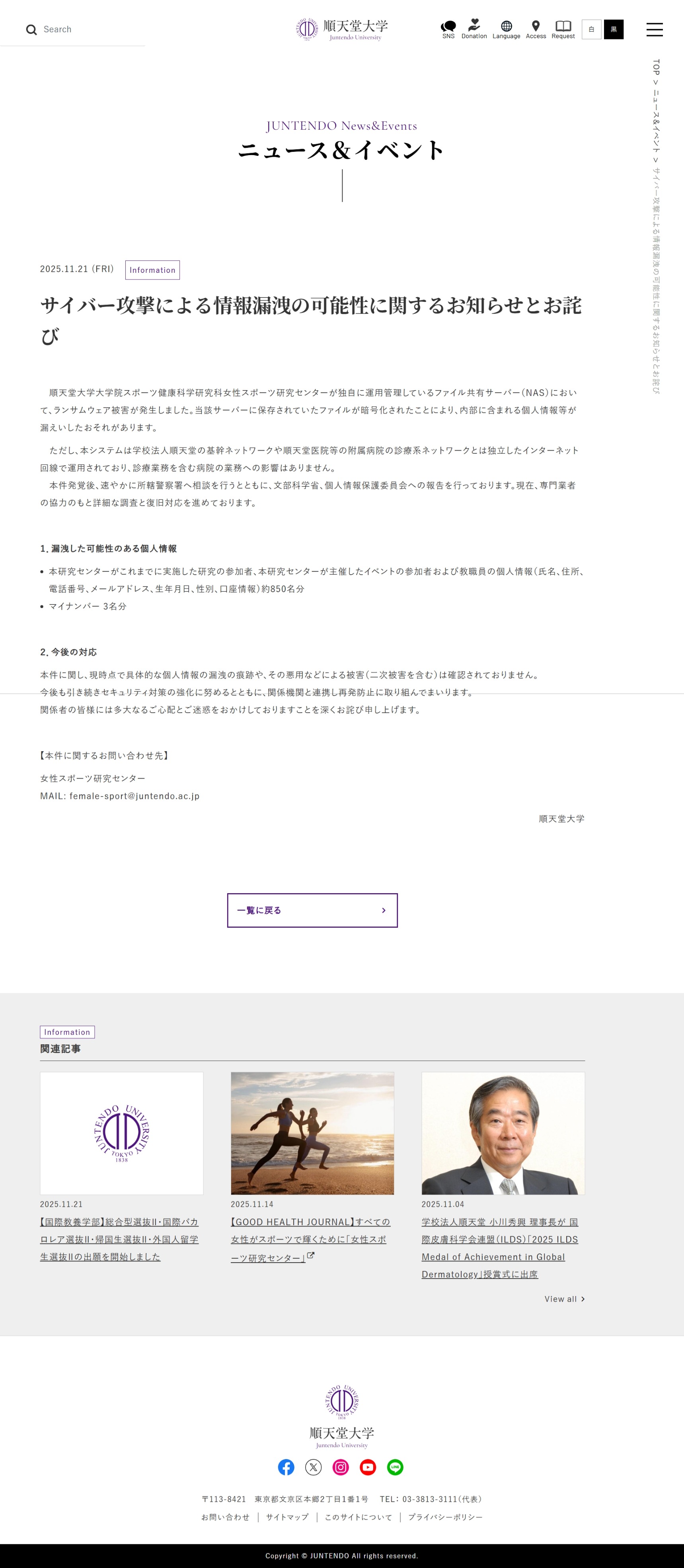 サイバー攻撃による情報漏洩の可能性に関するお知らせとお詫び|ニュース&イベント|順天堂大学