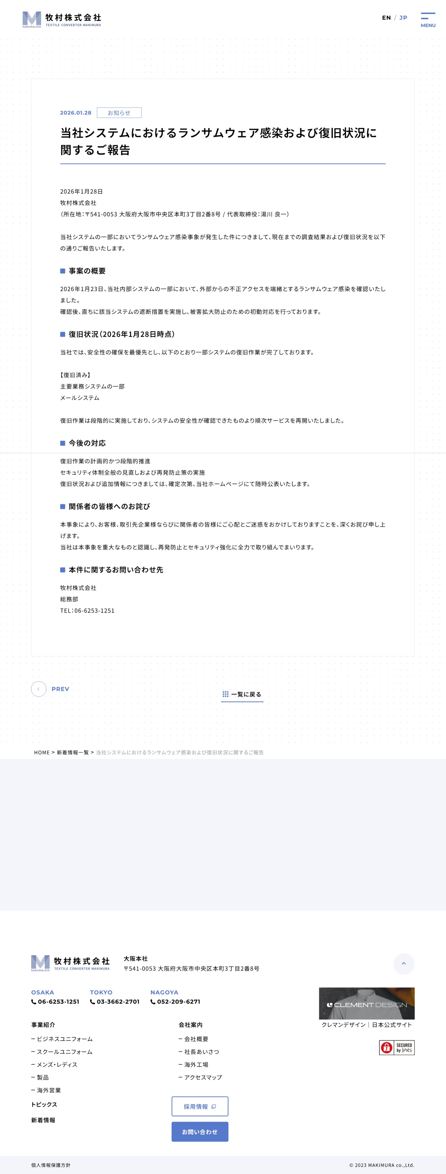 HOMEセキュリティ 2026年1月に公表されたITセキュリティ事案の一覧 2026年3月28日 セキュリティ 不正アクセス、ランサムウェア攻撃、Webサイト改ざん等のサイバー攻撃や、設定ミス、作業ミス、確認漏れ等の人的ミス等に起因するITセキュリティ事案が、毎日多数公表されています。本ブログでもピックアップして紹介していますが、個別に紹介しきれるものではありませんので、月単位にプレスリリース等へのリンクの一覧を掲載し、拾い集めたタイミングで随時更新していきます。※左のロゴ部分に、リリースが削除された際に備えた画面コピーや、関連する情報へのリンクを張っている場合があります。 流通科学大学1月31日(土)本学学生の個人情報の漏えいのおそれに関するお詫び – 流通科学大学 資生堂1月31日(土)【重要・緊急】第三者によるなりすまし不正ログインの疑いに伴う弊社対応およびお客さまへのお願い(第1報)()|お知らせ|資生堂オンラインストア TKCグループ1月30日(金)「TKC税理士ご紹介コーナー」「HP毎月更新サービス」における不正通信の発生および情報漏えいの可能性に関するお知らせ(第一報) 光栄1月30日(金)サイバー攻撃によるサーバダウンのお詫び ロジックベイン1月30日(金)不正アクセスに関するお知らせ 第2報 (2026/01/30) MCリテールエナジー(まちエネ)1月30日(金)サイバー攻撃によるシステム障害発生(2026年1月30日)のお知らせ インテグラル1月30日(金)当社ホームページへの不正アクセスに関するお詫びとご報告 コスミックコーポレーション1月30日(金)弊社コーポレートサイトへの不正アクセス事案に関する調査結果のご報告とお詫び[確報] | コスミックコーポレーション カンバス1月29日(木)弊社サーバへのランサムウェア攻撃に関する調査結果と今後の対応について(最終報告) シンシア1月29日(木)サイバー攻撃によるシステム障害発生に関するお知らせ(第 2 報) 樟蔭学園1月29日(木)不正サインイン事案の発生について フェンリル1月29日(木)弊社が利用する外部メールサービスへの不正アクセスに関する調査完了のお知らせ(安全確認のご報告) | ニュース | フェンリル 牧村1月28日(水)当社システムにおけるランサムウェア感染および復旧状況に関するご報告 山元紙包装社(パッケージショップJP)1月28日(水)弊社が運営する「パッケージショップJP」への不正アクセスによる 個人情報漏えいに関するお詫びとお知らせ 森町1月27日(火)【続報(終報)】【注意喚起】セキュリティサービス提供事業者における不正アクセス被害について/静岡県森町 新横浜グレイスホテル1月27日(火)不正アクセスによるお客様個人情報の第三者閲覧の可能性ならびに フィッシングサイトへ誘導するメッセージ配信に関するお詫びとお知らせ | 新横浜で宿泊なら新横浜グレイスホテル【公式】 釜浅商店1月27日(火)【重要】個人情報漏えいに関するお知らせとお詫び 静岡県1月27日(火)県及び市町の情報漏えいはありませんでした(委託事業者の不正アクセス被害(12月25日公表)の最終報) 兵庫県1月27日(火)兵庫県/兵庫県医療機関等生産性向上・職場環境整備緊急支援事業委託事業者における個人情報の漏えい ソフトバンク1月27日(火)プロキシーサーバーの不具合による事象の発生について | 企業・IR | ソフトバンク 茨城県国際交流協会1月26日(月)個人情報漏えいについてのお詫び 嘉麻市1月26日(月)個人情報の漏えいについて 興和江守1月26日(月)ランサムウェア感染によるシステム障害に関する対応状況について(第2報) 静岡県1月26日(月)メール誤送信による個人情報漏えい事案の発生について アスマーク(D style web)1月26日(月)【重要】不正アクセス対策に伴う一部ポイント交換の一時停止について Authense法律事務所1月26日(月)ニュース(第三者による不正なアクセスに関するご報告とお詫び )| Authense法律事務所 ジーオーティー1月26日(月)個人情報流出の可能性に関するお詫びとお知らせ | 株式会社ジーオーティー 明治安田1月26日(月)出向者による情報持ち出しに関する調査結果について インテリックス(JUST CURTAIN)1月26日(月)弊社が運営する「ジャストカーテンオンラインショップ」への不正アクセスによる 個人情報漏えいに関するお詫びとお知らせ 牧村1月23日(金)弊社システムにおけるランサムウェア感染についてのお知らせとお詫び | 牧村株式会社 エバラ食品1月23日(金)会員サイト「エバラ CLUB」における表示不具合に関するお詫びとご報告 関西総合システム1月23日(金)弊社にて発生したセキュリティインシデントについて (第二報) | 関西総合システム ボンフォーム1月23日(金)オンラインストア一部運用再開について さいたま市1月23日(金)さいたま市/(令和8年1月23日発表)鈴谷公民館委託業務従事者による公共施設予約システムへの不正アクセスについて TOKAIコミュニケーションズ1月23日(金)OneOffice メールソリューションにおける不正アクセスによる個人情報漏洩についてのお知らせとお詫び(第三報) 宮崎日本大学学園1月23日(金)サポート詐欺事案に関するご報告➔宮崎
