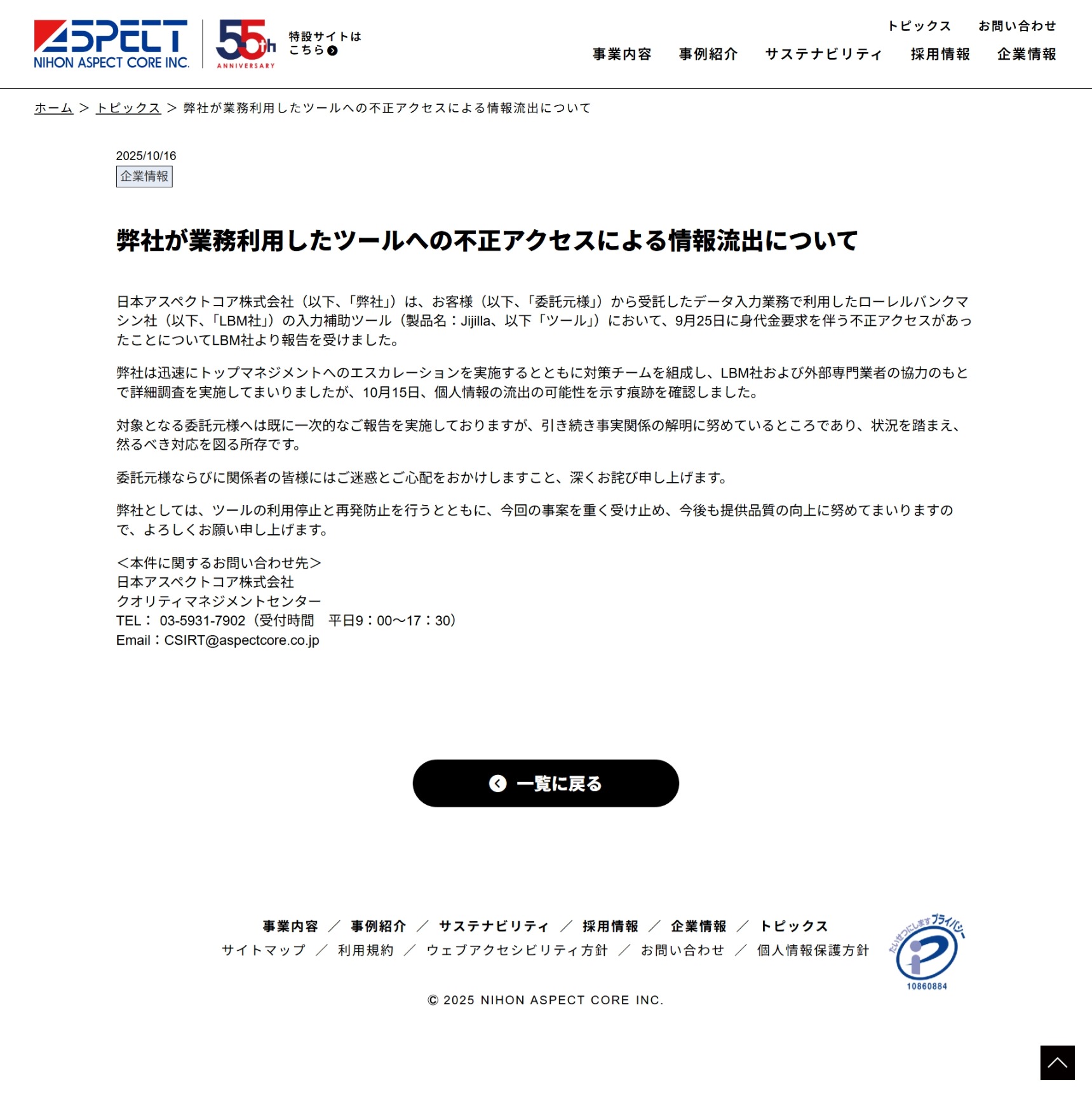 弊社が業務利用したツールへの不正アクセスによる情報流出について事案の概要:日本アスペクトコア株式会社は2025年10月16日、同社が業務で利用していたローレルバンクマシン社の入力補助ツール「Jijilla」に対し、9月25日に身代金要求を伴う不正アクセスがあったことを受け、個人情報が流出した可能性があると発表しました。報告を受けた同社は直ちに対策チームを立ち上げ、ローレルバンクマシン社および外部専門業者と連携して調査を進めた結果、10月15日に流出の痕跡を確認したとしています。既に関係する委託元企業には一次報告を行っており、今後も事実関係の解明と再発防止に努めるとともに、ツールの利用停止措置を講じたとしています。同社は関係者に対し深く謝罪するとともに、引き続き情報管理体制の強化と提供品質の向上に取り組むとしています。