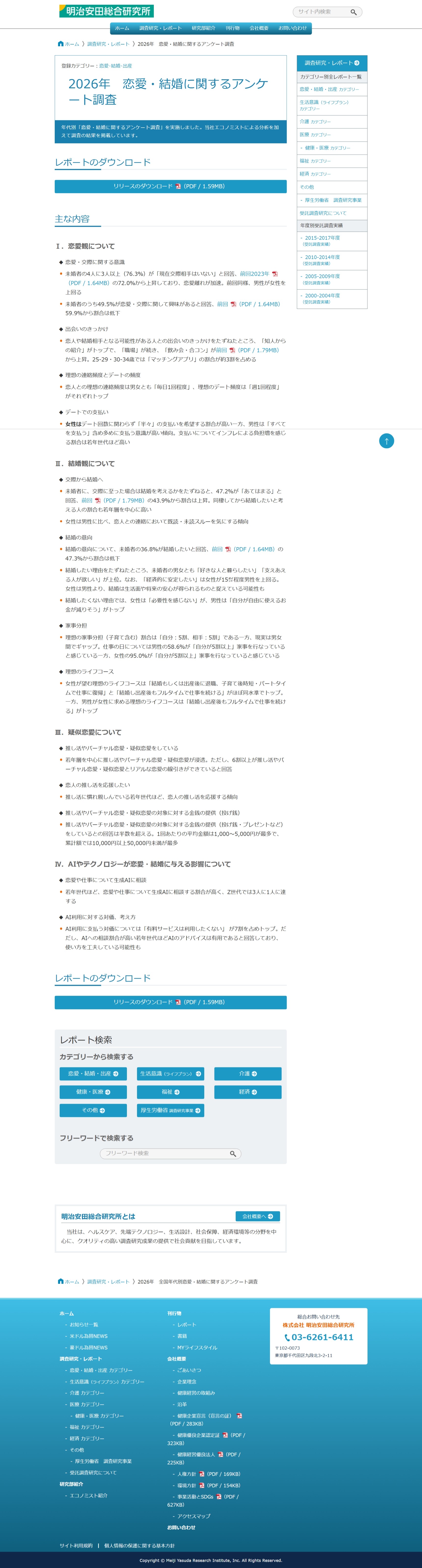 明治安田総合研究所が「恋愛・結婚に関するアンケート調査」レポートを2026年2月5日に発表しました。本レポートは、加速する「恋愛離れ」と「結婚観の二極化」、そして「推し活」や「生成AI」といった新たなトレンドが交錯する現代の恋愛・結婚市場の実態を浮き彫りにしています。