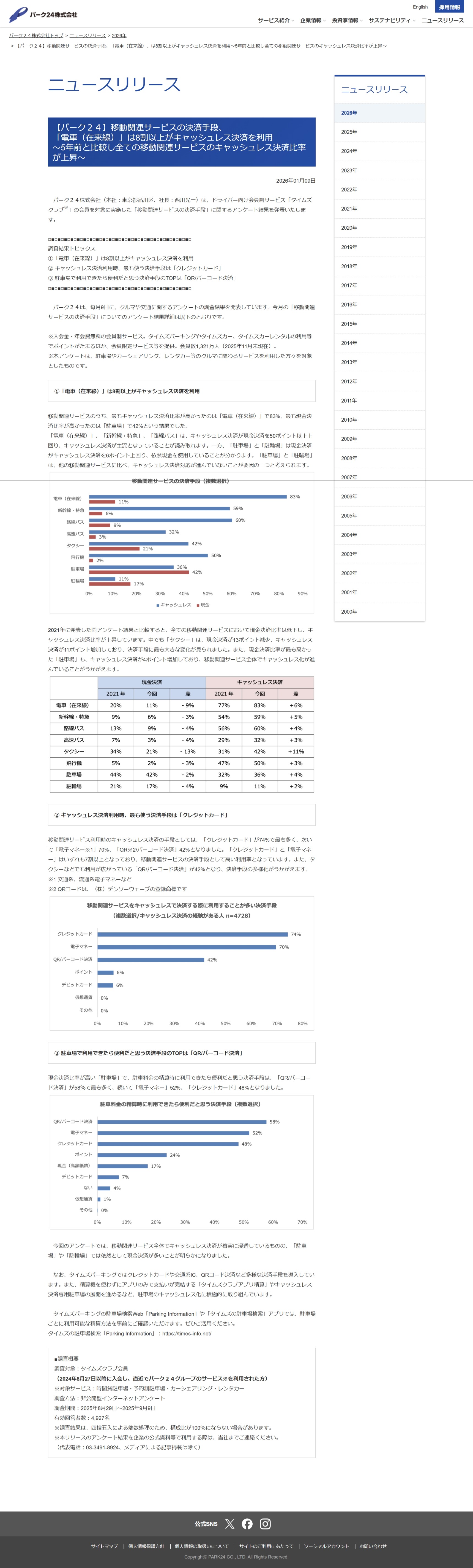 【パーク24】移動関連サービスの決済手段、「電車(在来線)」は8割以上がキャッシュレス決済を利用〜5年前と比較し全ての移動関連サービスのキャッシュレス決済比率が上昇〜|パーク24株式会社サンプル数:4,927
