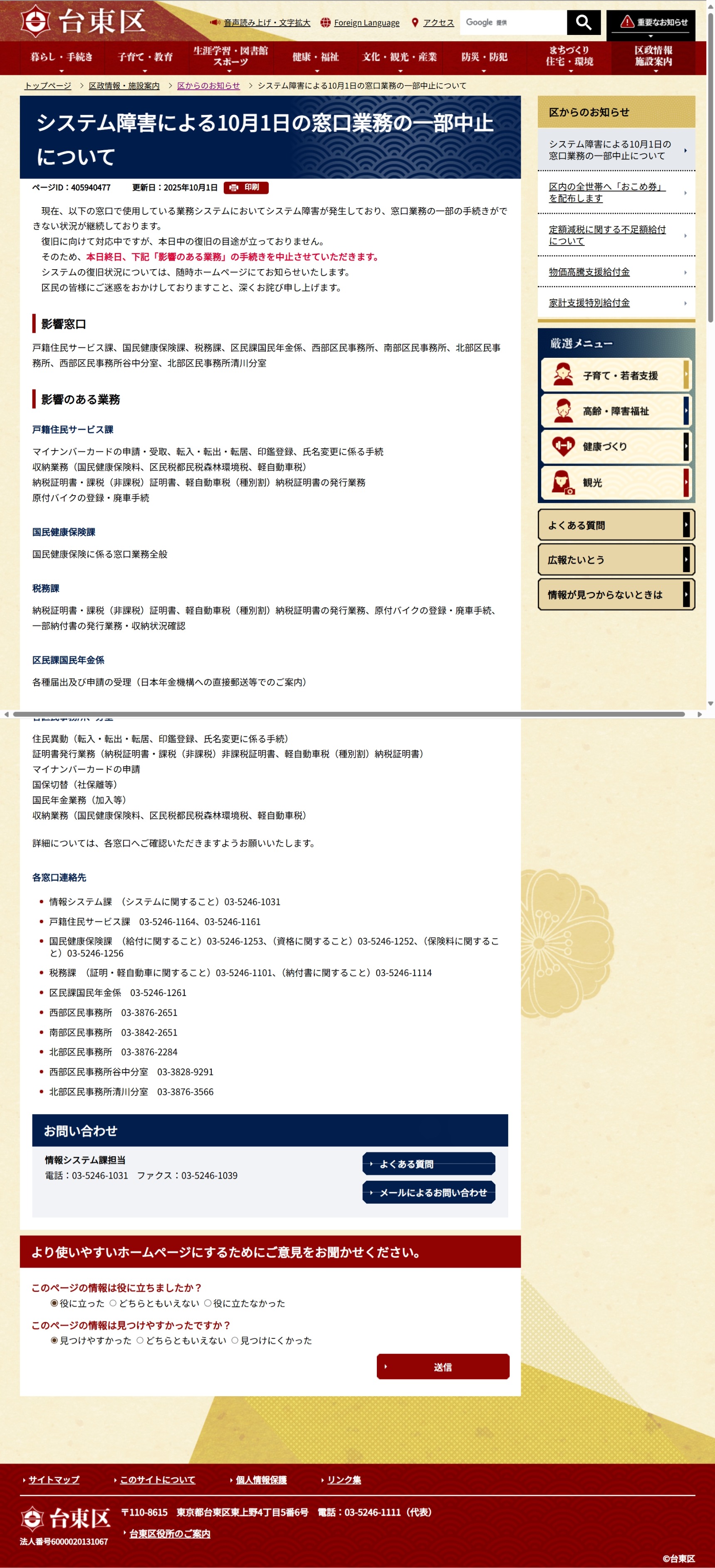 システム障害による10月1日の窓口業務の一部中止について概要:台東区は、2025年10月1日に発生した業務システムの障害により、区役所および各区民事務所での一部窓口業務が終日中止となると発表しました。影響を受けたのは、戸籍住民サービス課、国民健康保険課、税務課、区民課国民年金係など複数の部署で、マイナンバーカードの申請・受取、住民異動手続き、納税証明書の発行、原付バイクの登録・廃車などの業務が停止しています。区は現在復旧作業を進めているものの、本日中の復旧の見通しは立っておらず、区民に対して深く謝罪するとともに、最新情報はホームページで随時案内するとしています。