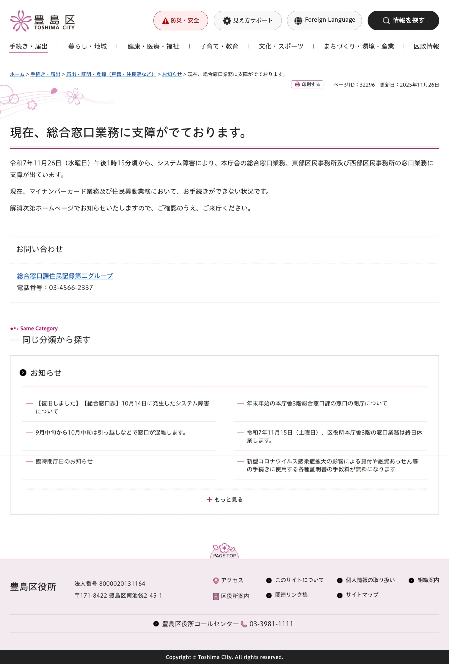 マイナンバーカード関連の業務システムに障害が発生し、区民事務所などの総合窓口業務に支障が出ましたが、障害は同日中に解消されています。