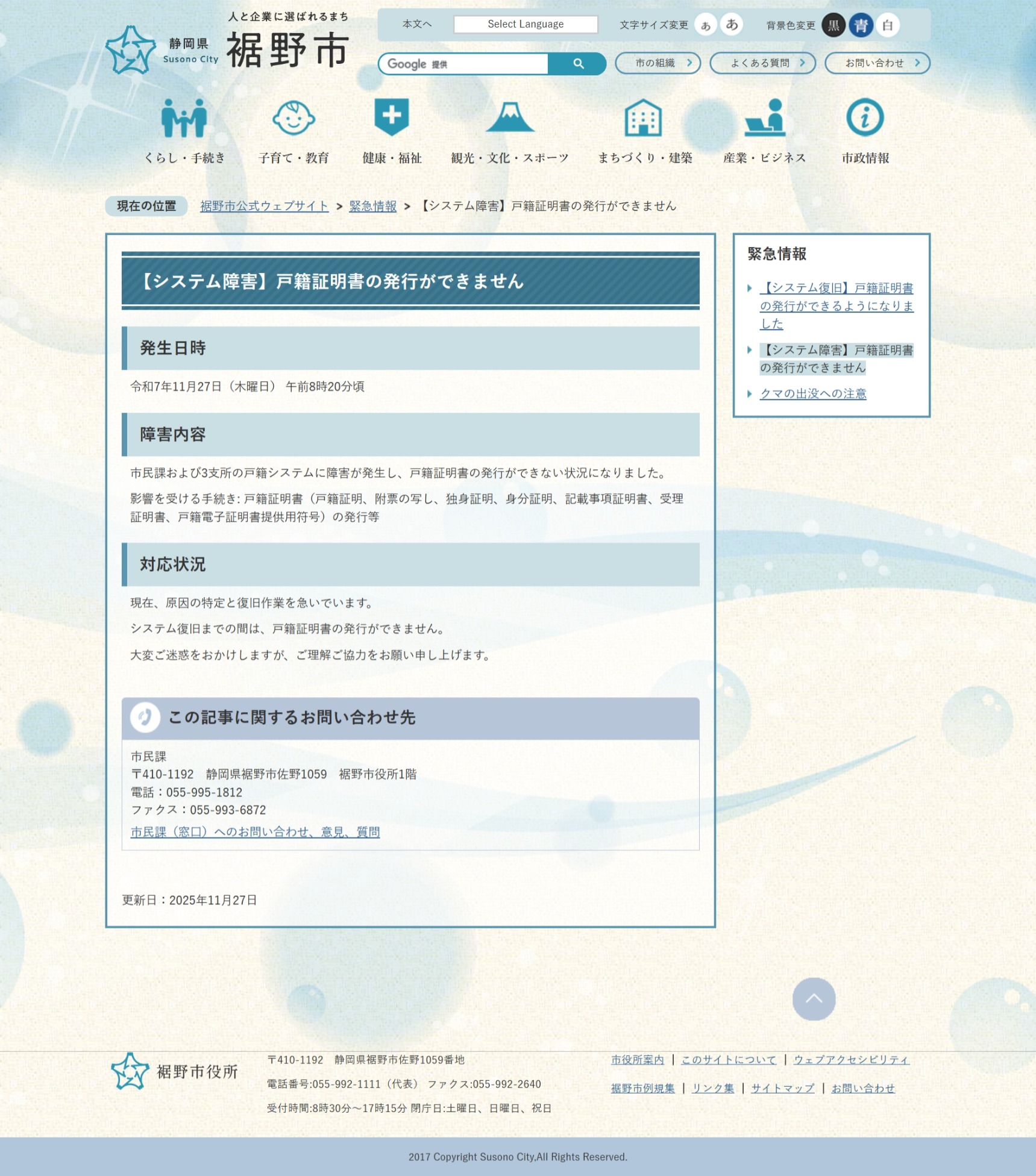 戸籍証明書が発行できない状態となりましたが、同日中にシステムが復旧し、通常通りの交付が可能となりました。