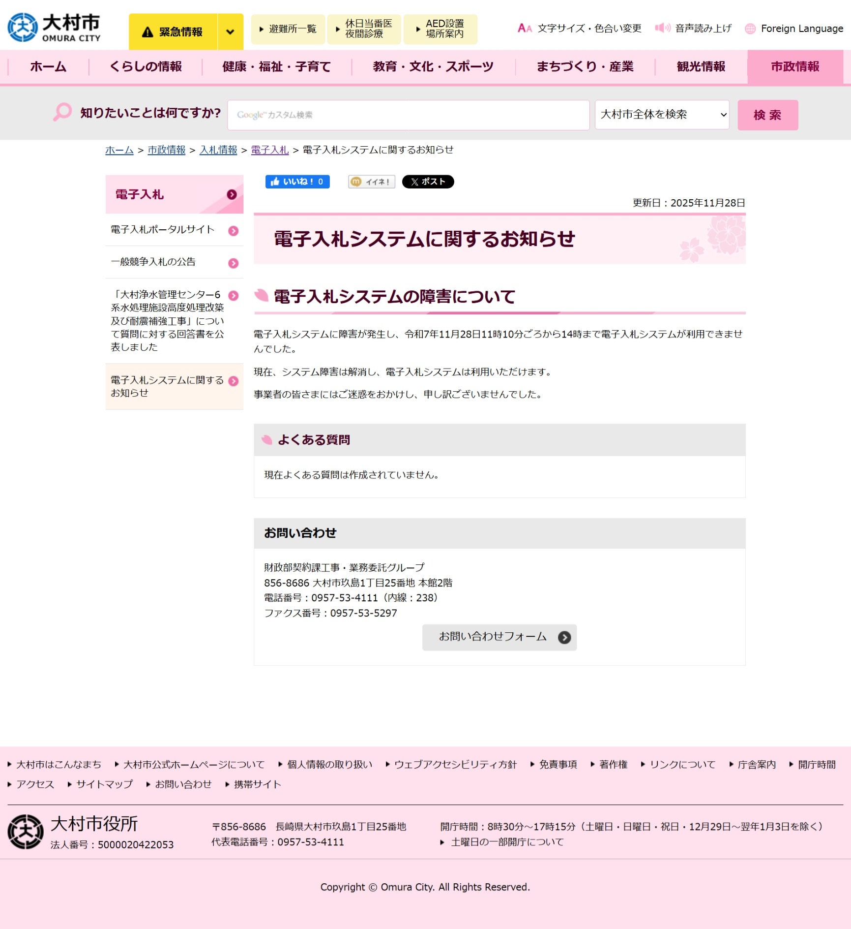 電子入札システムに障害が発生し、利用者に不便が生じましたが、同日中に復旧作業が完了しています。