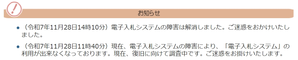 公共事業などの電子入札システムに障害が発生し、利用者に不便が生じましたが、同日中に復旧作業が完了しています。