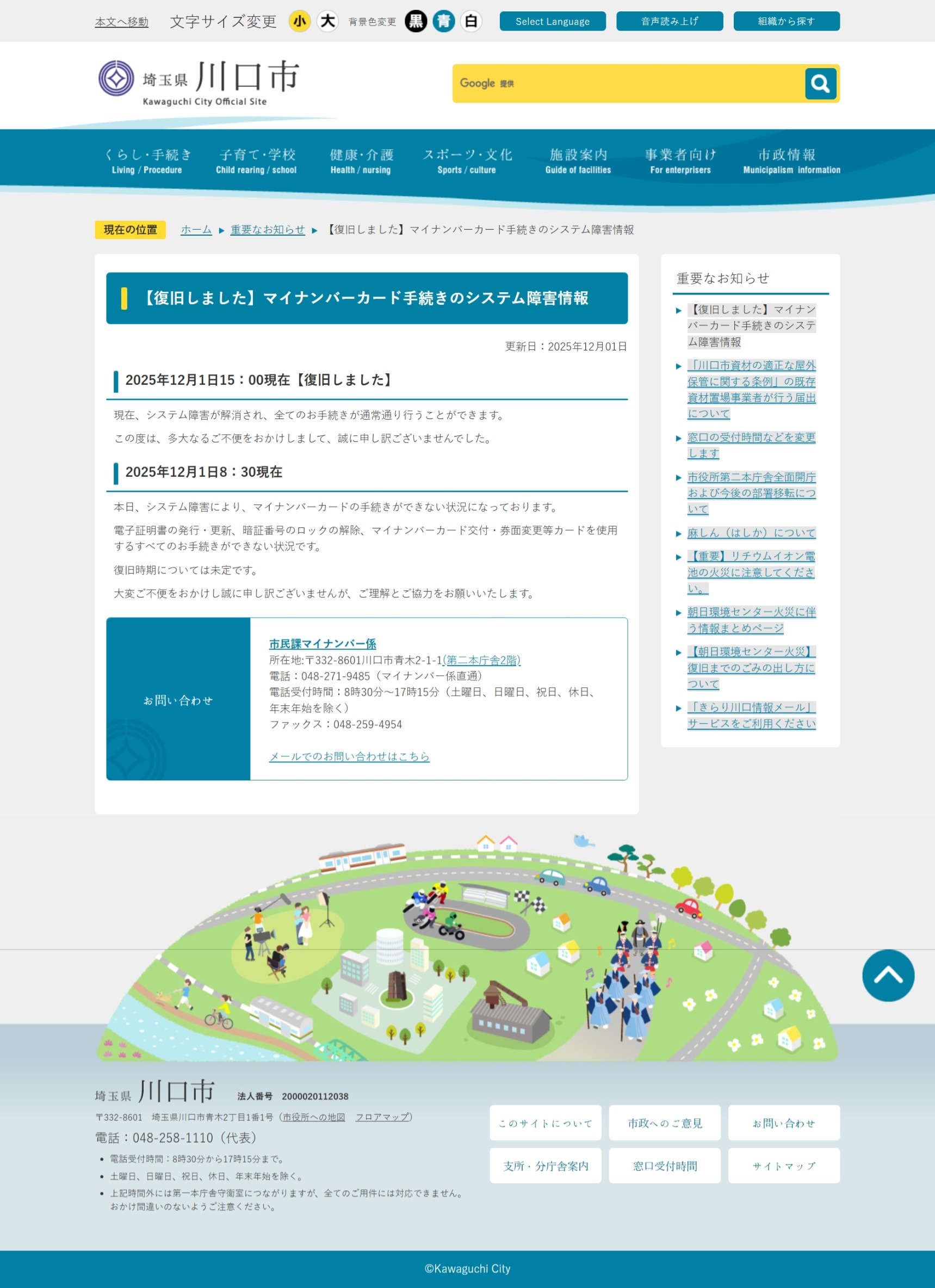 【復旧しました】マイナンバーカード手続きのシステム障害情報/川口市ホームページ