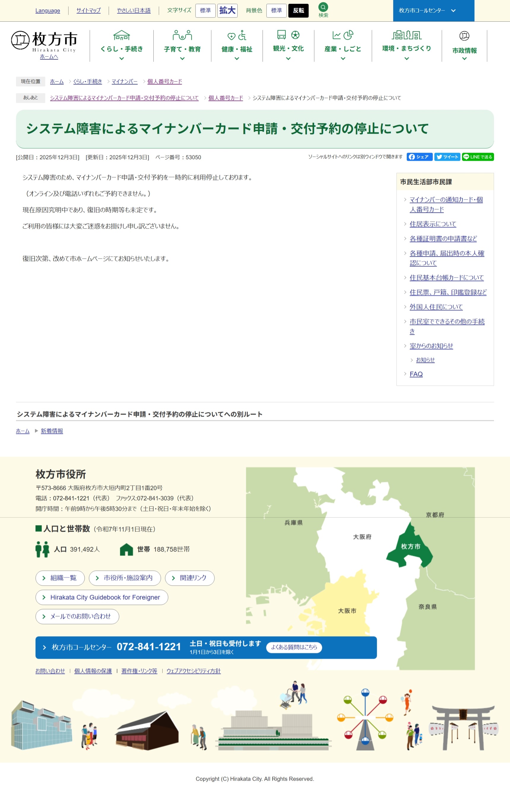 システム障害によるマイナンバーカード申請・交付予約の停止について | 枚方市ホームページ