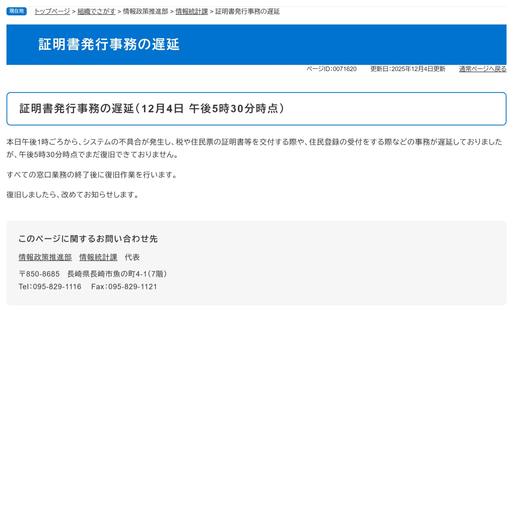 12月4日午後1時頃から証明書発行事務に遅延が発生していましたが、市は12月5日朝までに解消したと発表しました。