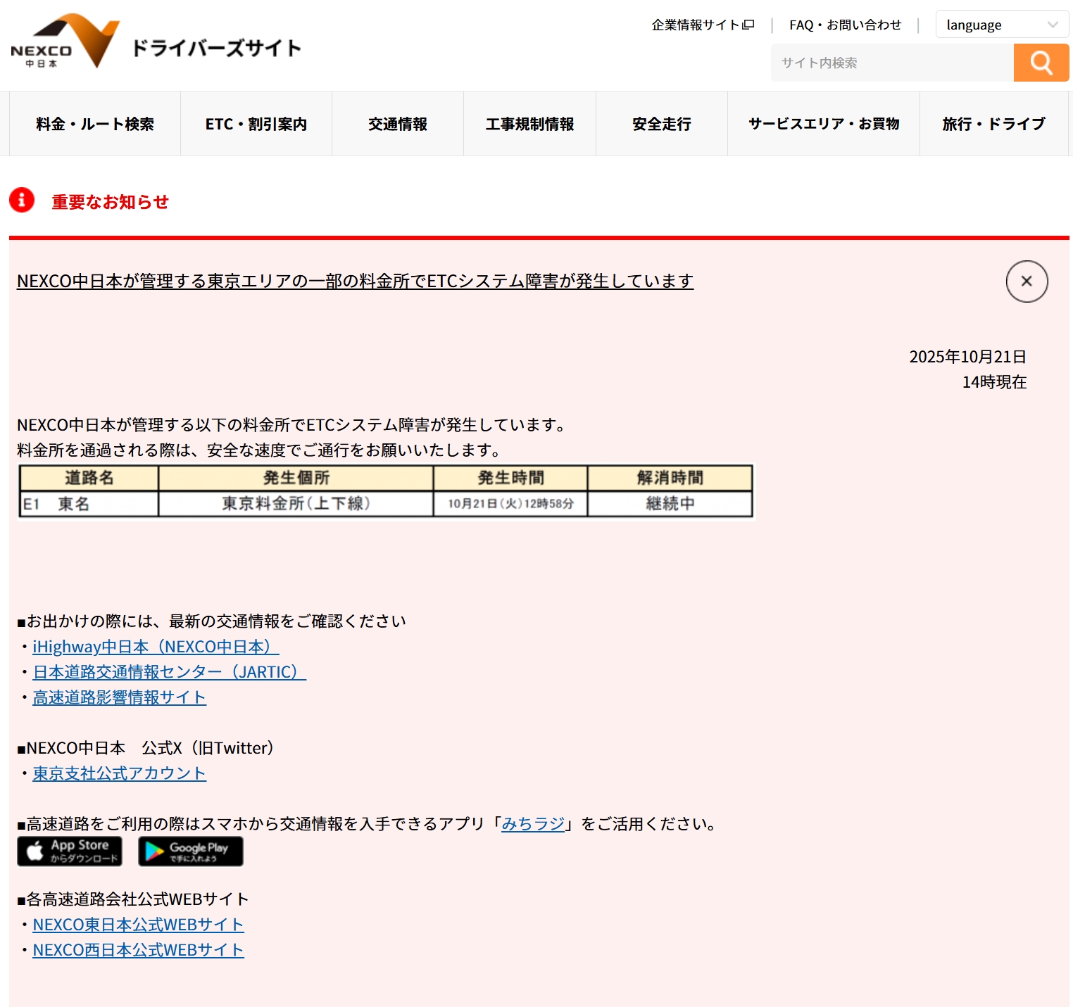 E1東名 東京料金所で発生していたETCシステム障害は解消いたしました概要:2025年10月21日、NEXCO中日本は、同社が管理するE1東名高速道路・東京料金所において発生していたETCシステム障害が同日14時50分に解消されたと発表しました。障害発生中に同料金所を通行した利用者に対しては、通行料金の請求を行わない方針で、同社は利用者に対し謝意を示すとともに、最新の交通情報の確認を呼びかけています。