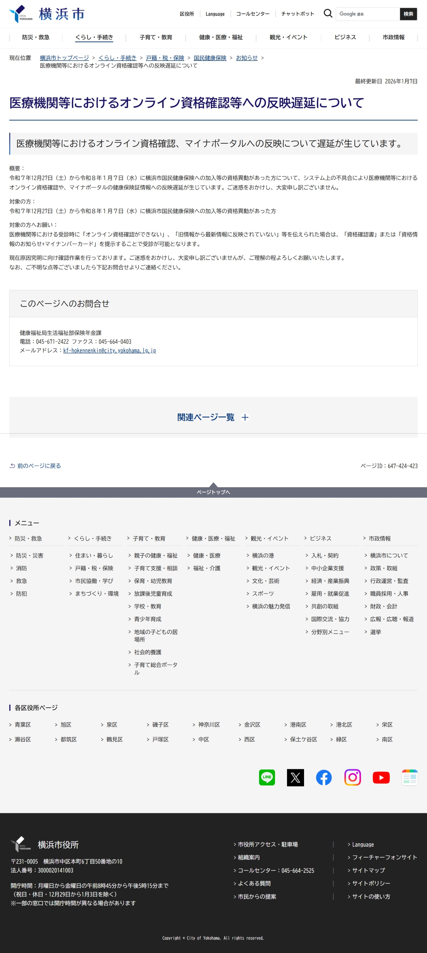 横浜市は2026年1月7日、国民健康保険のシステムにおいて不具合が発生し、加入者情報の「オンライン資格確認」システムおよび「マイナポータル」への反映に遅れが生じていると発表しました。