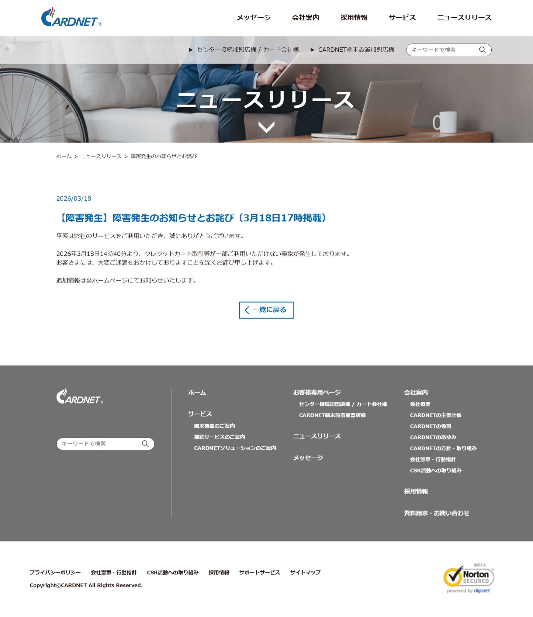 障害発生のお知らせとお詫び(回復報) | ニュースリリース | CARDNET