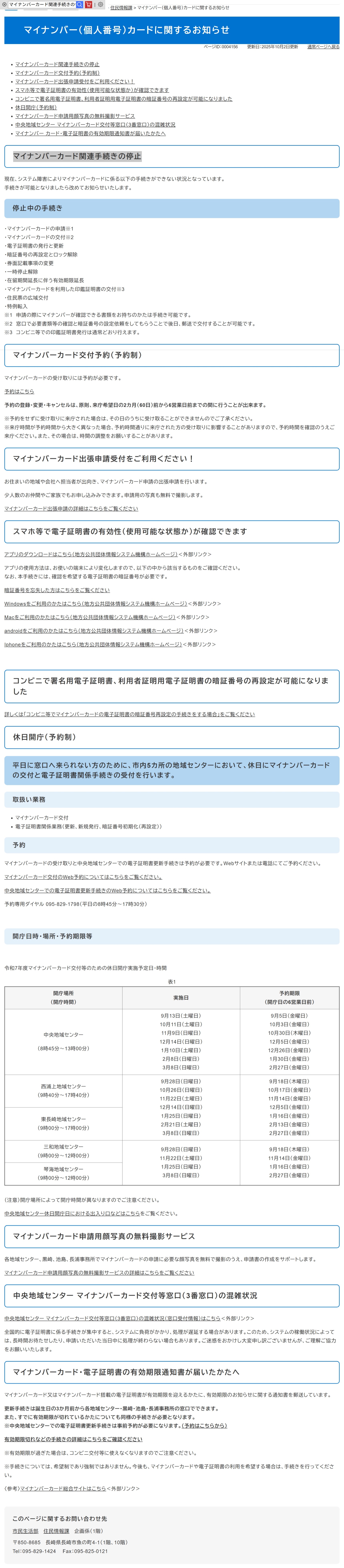 マイナンバーカード関連手続きの停止概要:長崎市は、現在発生しているシステム障害の影響により、マイナンバーカードに関する複数の手続きを一時停止していると発表しました。停止中の手続きには、カードの申請・交付、電子証明書の発行・更新、暗証番号の再設定やロック解除、券面記載事項の変更、印鑑証明書の交付(窓口対応分)、住民票の広域交付、特例転入などが含まれており、復旧次第改めて案内される予定です。なお、申請時にマイナンバーが確認できる書類を持参した場合や、コンビニでの印鑑証明書発行など一部の手続きは継続可能とされています。