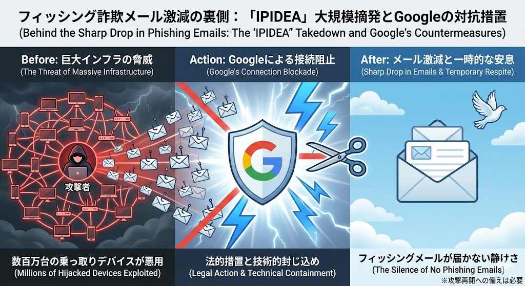 最近、フィッシング詐欺メールが急に減ったと感じませんか?その裏側にある「大規模な摘発劇」について