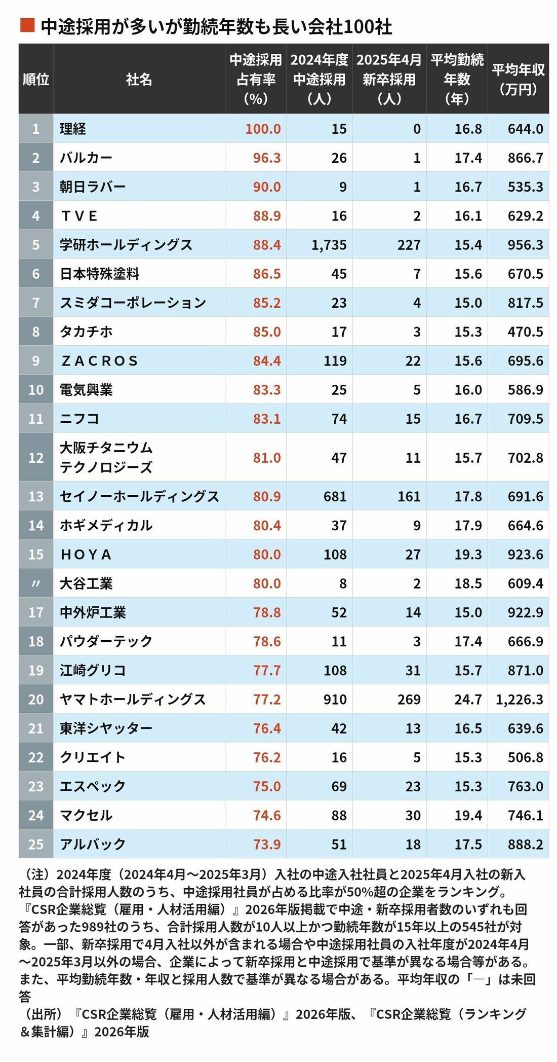 深刻な人手不足を背景に、多くの企業が中途採用へシフトしています。採用人数が新卒・中途合計10人以上かつ中途採用占有率が50%超、平均勤続年数が15年以上の企業を中途採用占有率が高い順にランキングしました。認定・表彰・アワード・コンテスト等