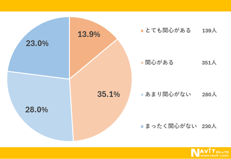 ガーデニングへの関心についてたずねたアンケートです。「とても関心がある」と回答した人は13.9%、「関心がある」と回答した人は35.1%で、合計すると49.0%と、ほぼ半数の人がガーデニングに関心を持っていることがわかりました。