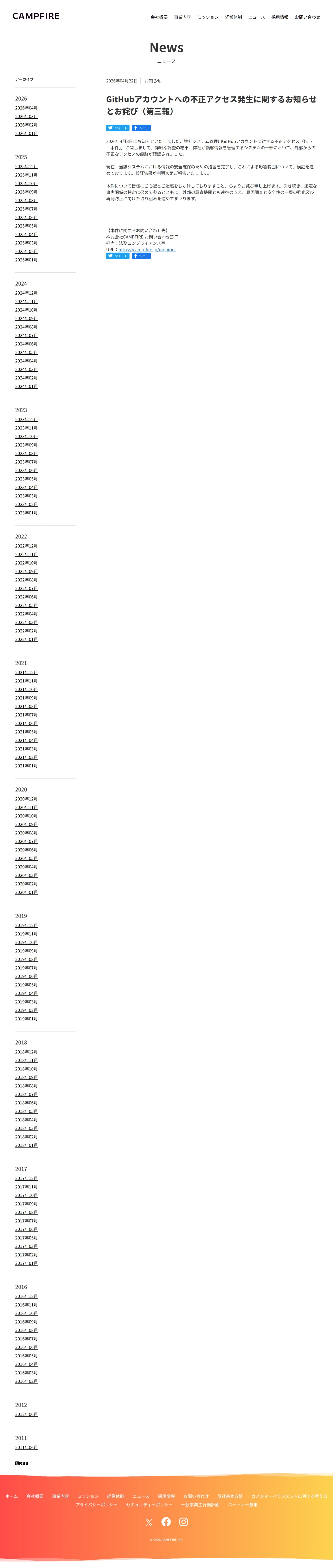 GitHubアカウントへの不正アクセス発生に関するお知らせとお詫び(第三報) – 株式会社CAMPFIRE