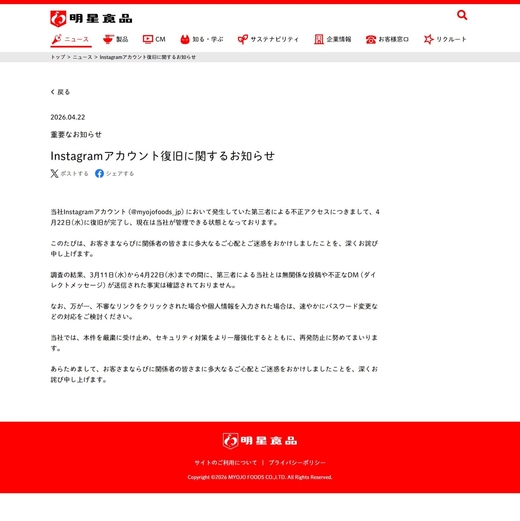 当社Instagramアカウント (@myojofoods_jp) において発生していた第三者による不正アクセスにつきまして、4月22日(水)に復旧が完了し、現在は当社が管理できる状態となっております。調査の結果、3月11日(水)から4月22日(水)までの間に、第三者による当社とは無関係な投稿や不正なDM (ダイレクトメッセージ) が送信された事実は確認されておりません。