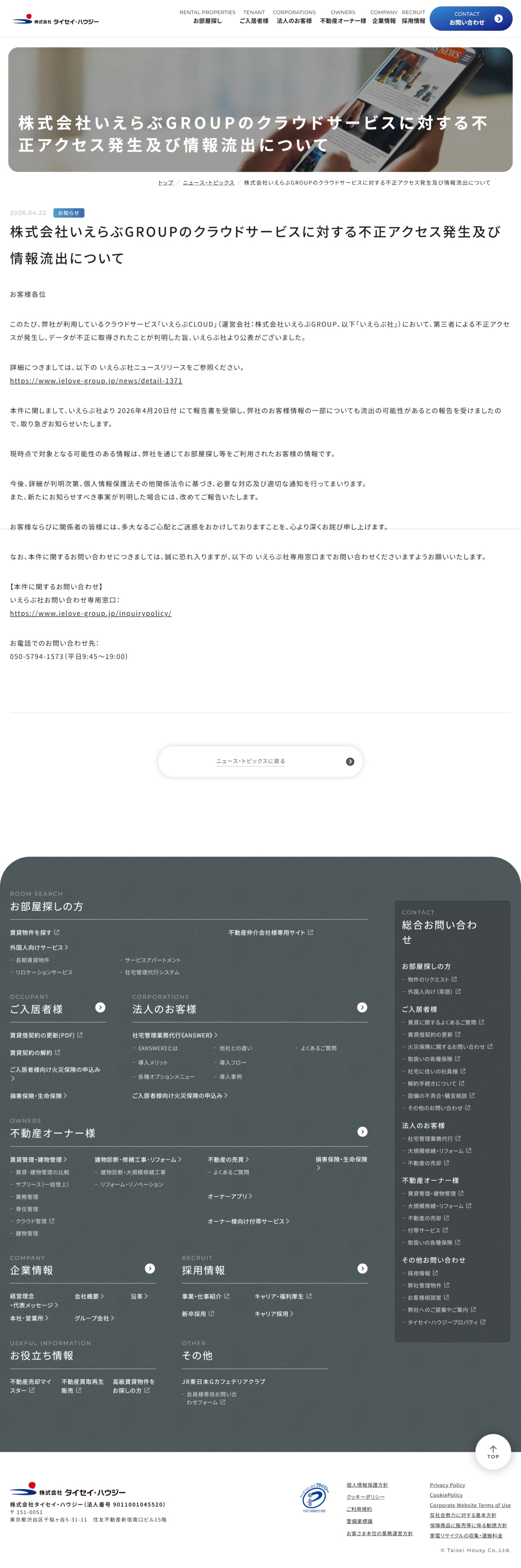 株式会社いえらぶGROUPのクラウドサービスに対する不正アクセス発生及び情報流出について – タイセイ・ハウジー
