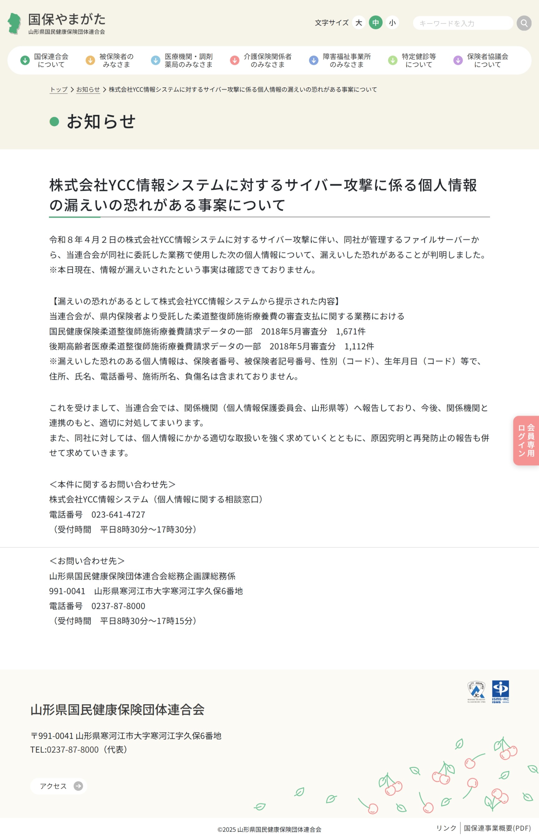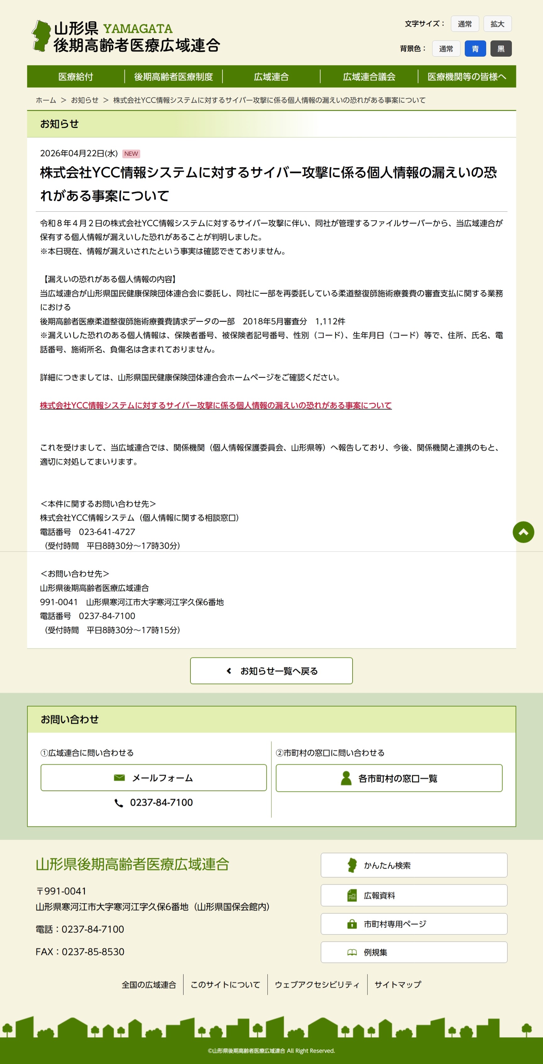 株式会社YCC情報システムに対するサイバー攻撃に係る個人情報の漏えいの恐れがある事案について | お知らせ | 山形県後期高齢者医療広域連合