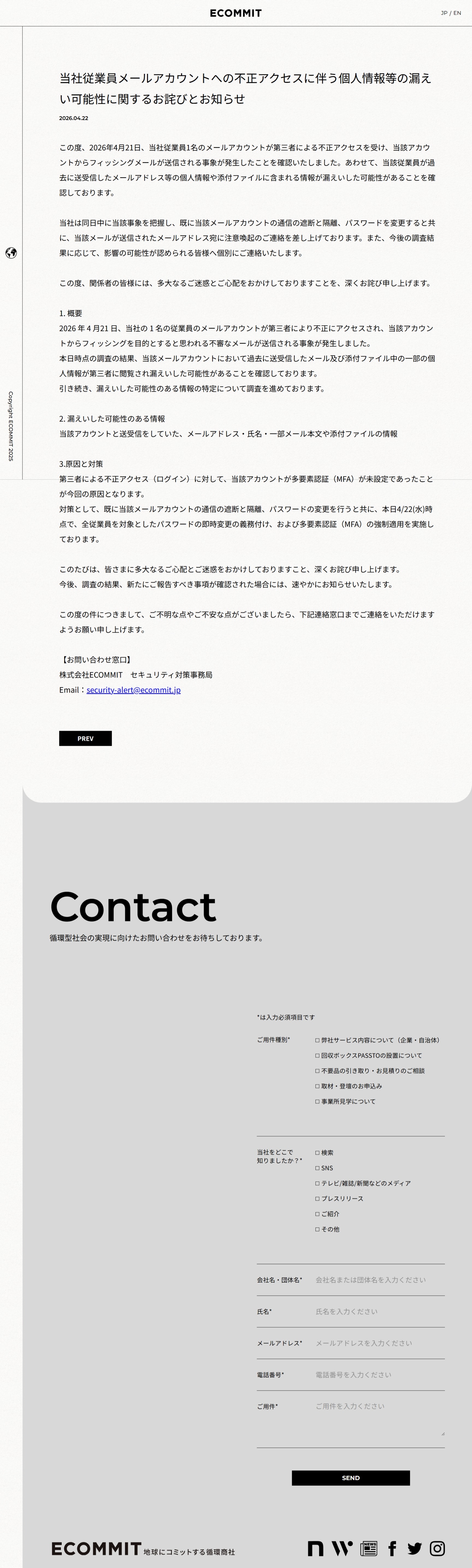 当社従業員メールアカウントへの不正アクセスに伴う個人情報等の漏えい可能性に関するお詫びとお知らせ | ECOMMIT