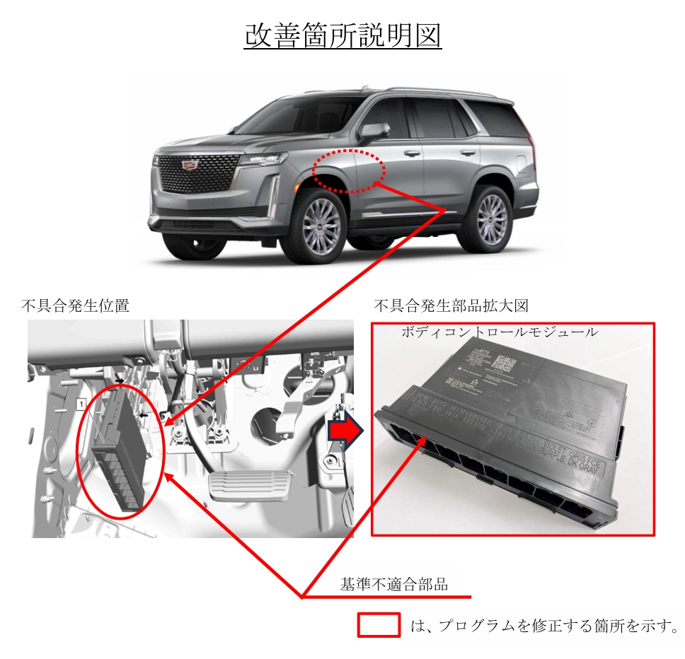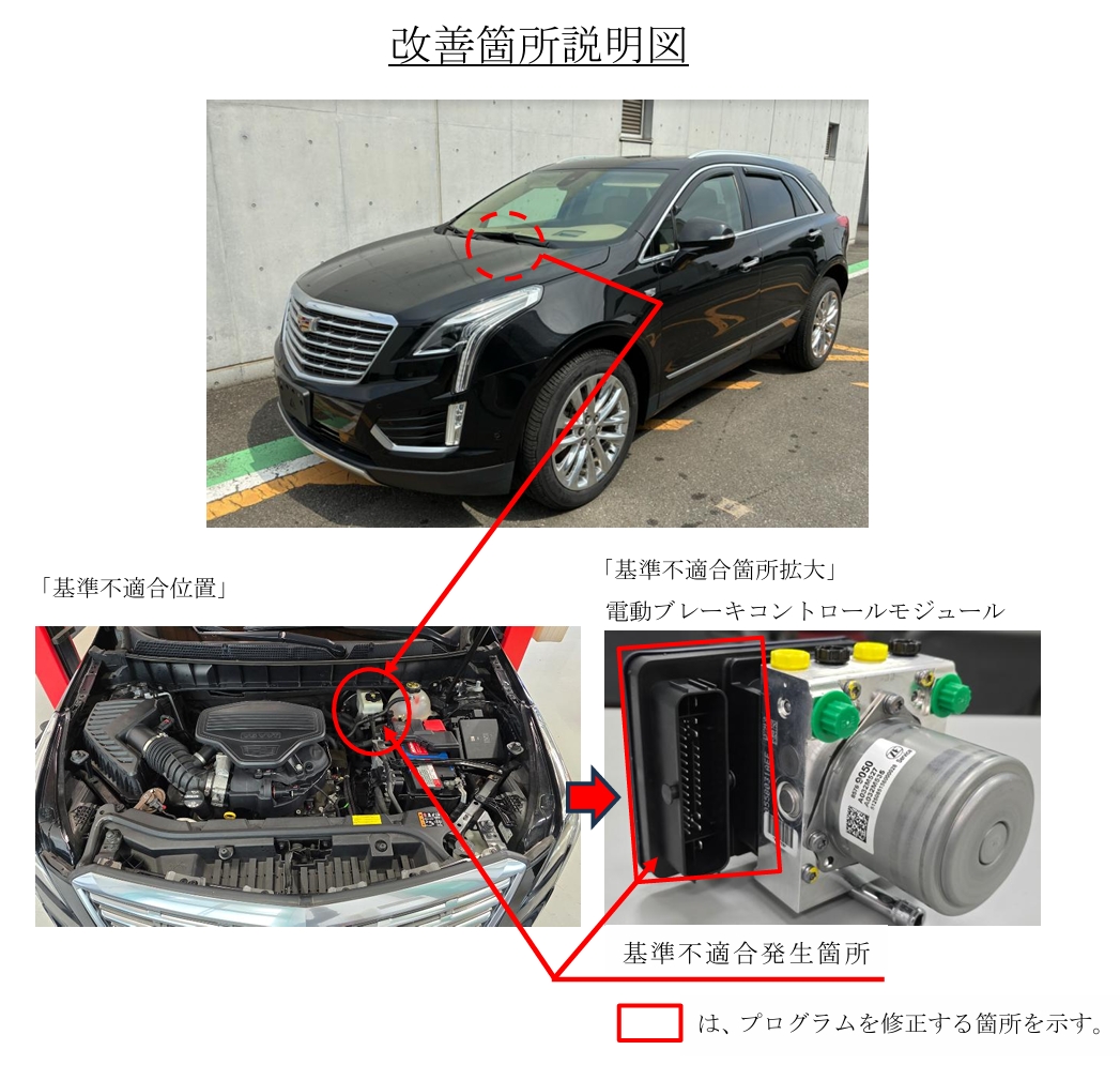 電動ブレーキコントロールモジュールにおいて、設計検討が不十分なため、プログラムに不備がある。そのため、電動パーキングブレーキシステムに不具合が発生した状態でパーキングブレーキを作動させた場合、赤色の警告灯が点滅せず、保安基準に適合しない。