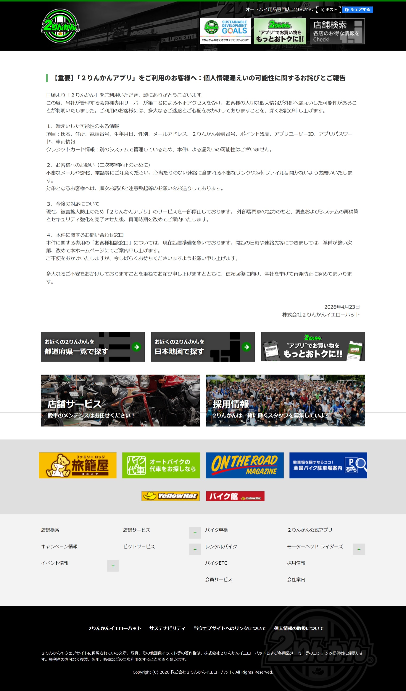 【重要】「2りんかんアプリ」をご利用のお客様へ:個人情報漏えいの可能性に関するお詫びとご報告