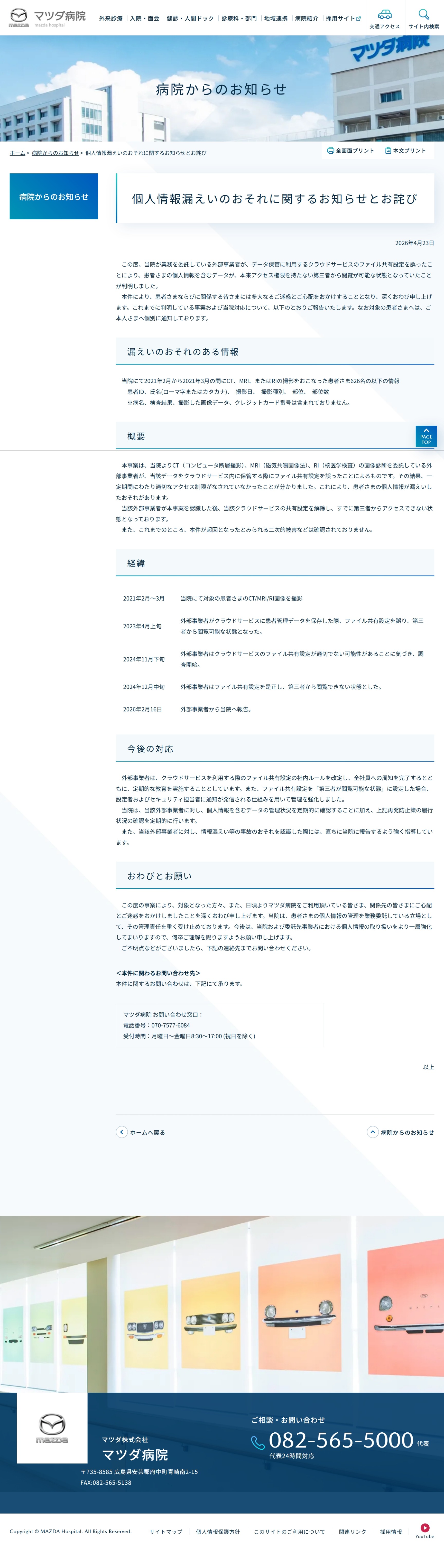 個人情報漏えいのおそれに関するお知らせとお詫び | 病院からのお知らせ | マツダ病院