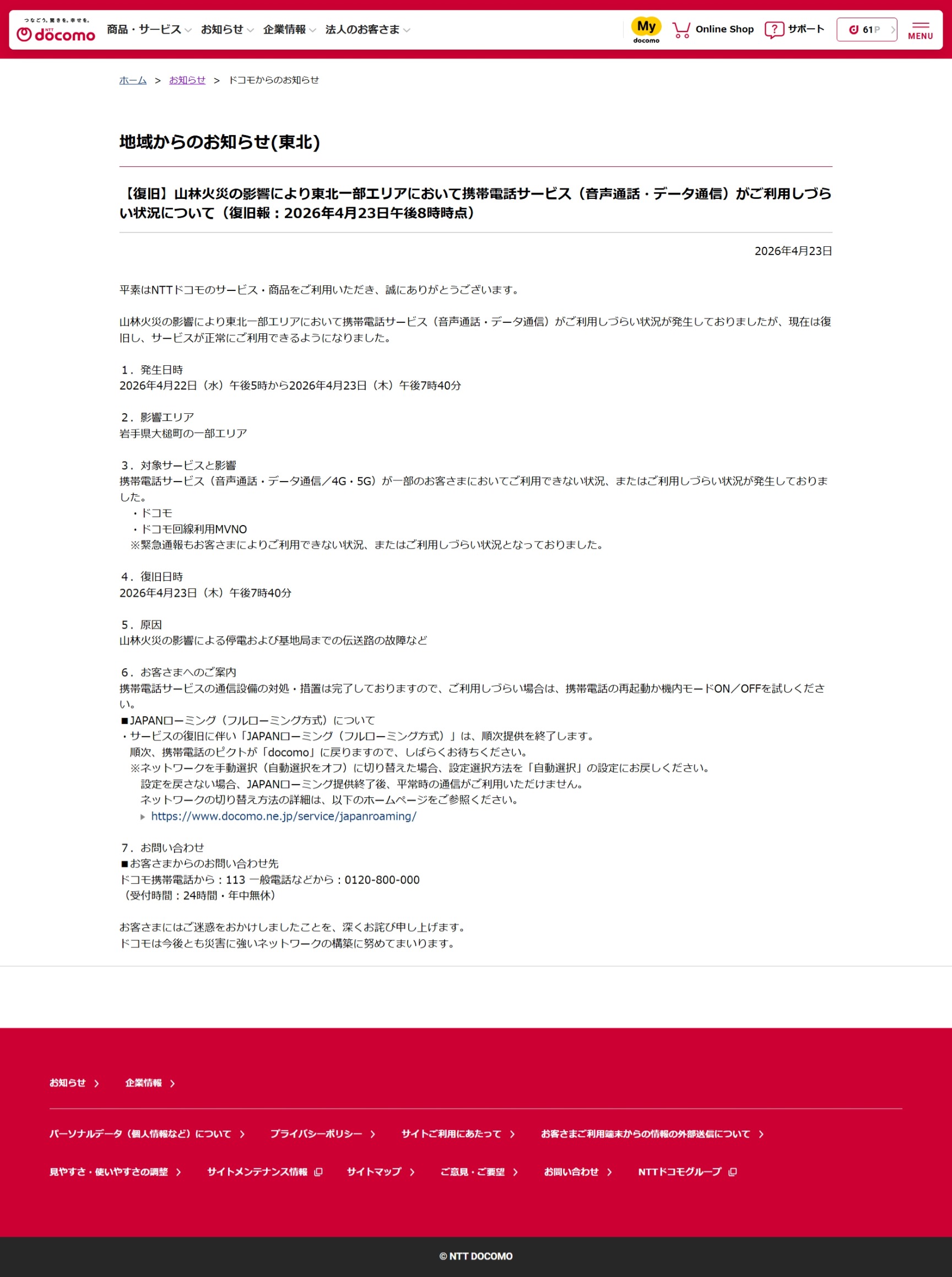 【復旧】山林火災の影響により東北一部エリアにおいて携帯電話サービス(音声通話・データ通信)がご利用しづらい状況について(復旧報:2026年4月23日午後8時時点) | お知らせ | NTTドコモ