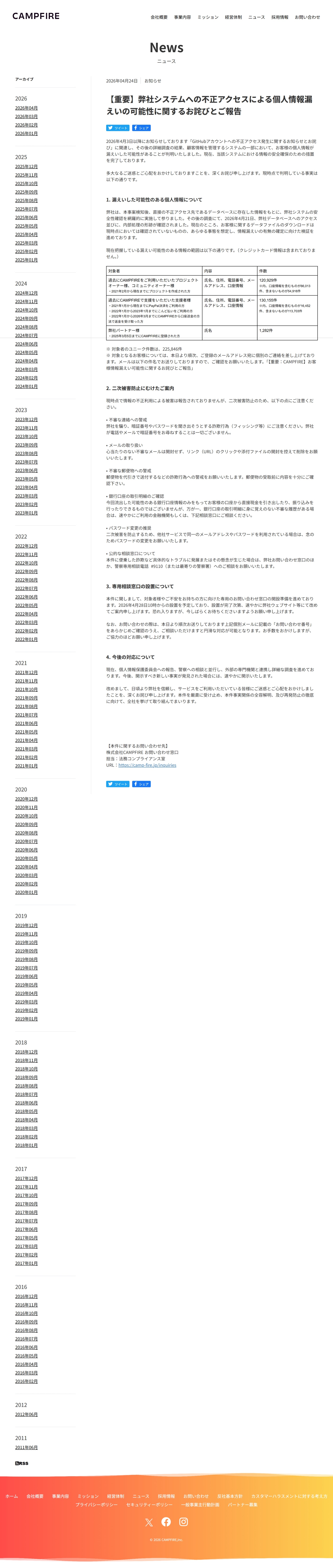 【重要】弊社システムへの不正アクセスによる個人情報漏えいの可能性に関するお詫びとご報告 – 株式会社CAMPFIRE