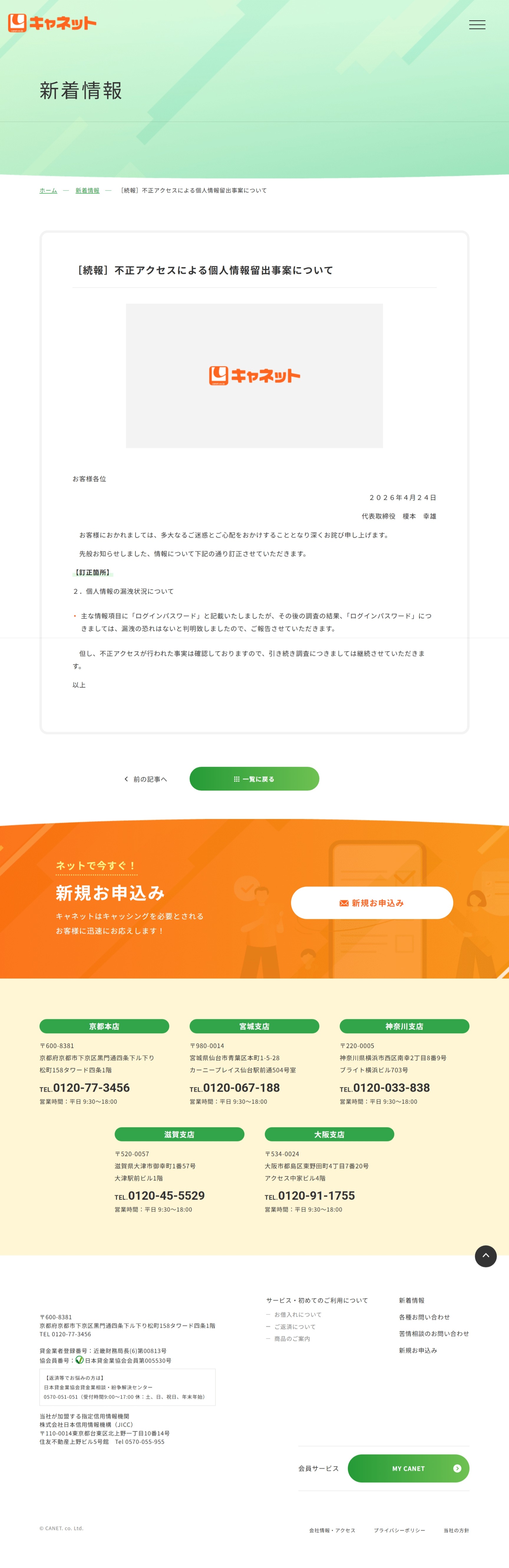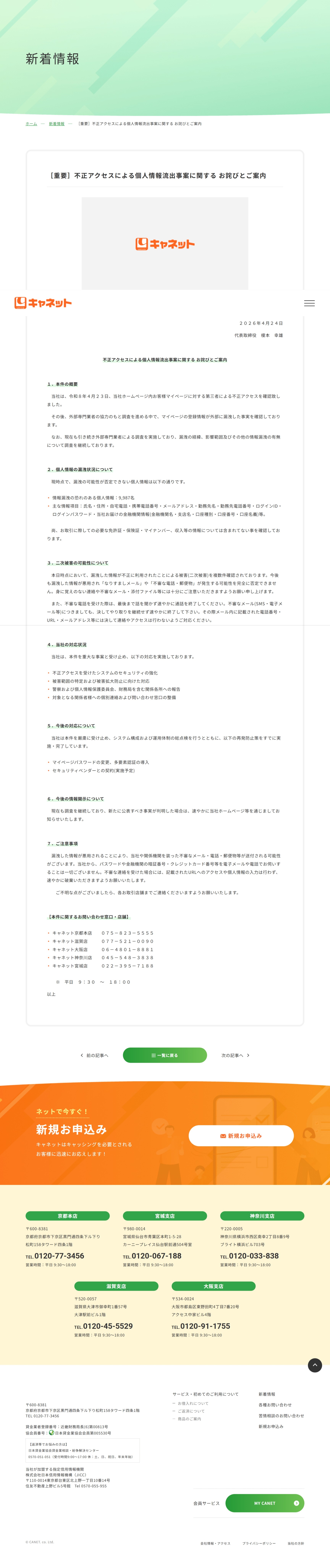 不正アクセスによる個人情報流出事案に関するお詫びとご案内 – キャッシングのキャネット