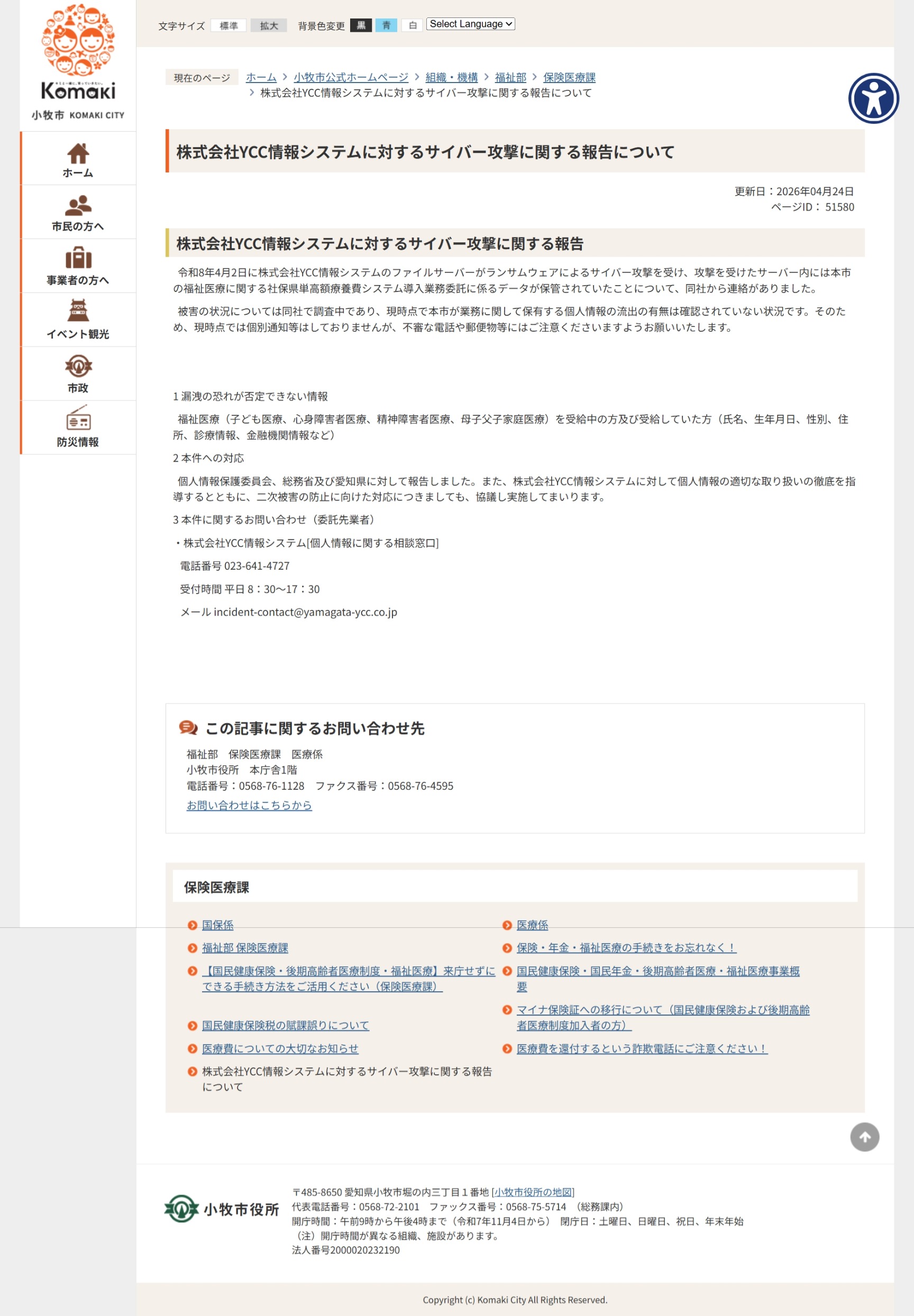 令和8年4月2日に株式会社YCC情報システムのファイルサーバーがランサムウェアによるサイバー攻撃を受け、攻撃を受けたサーバー内には本市の福祉医療に関する社保県単高額療養費システム導入業務委託に係るデータが保管されていたことについて、同社から連絡がありました。被害の状況については同社で調査中であり、現時点で本市が業務に関して保有する個人情報の流出の有無は確認れていない状況です。