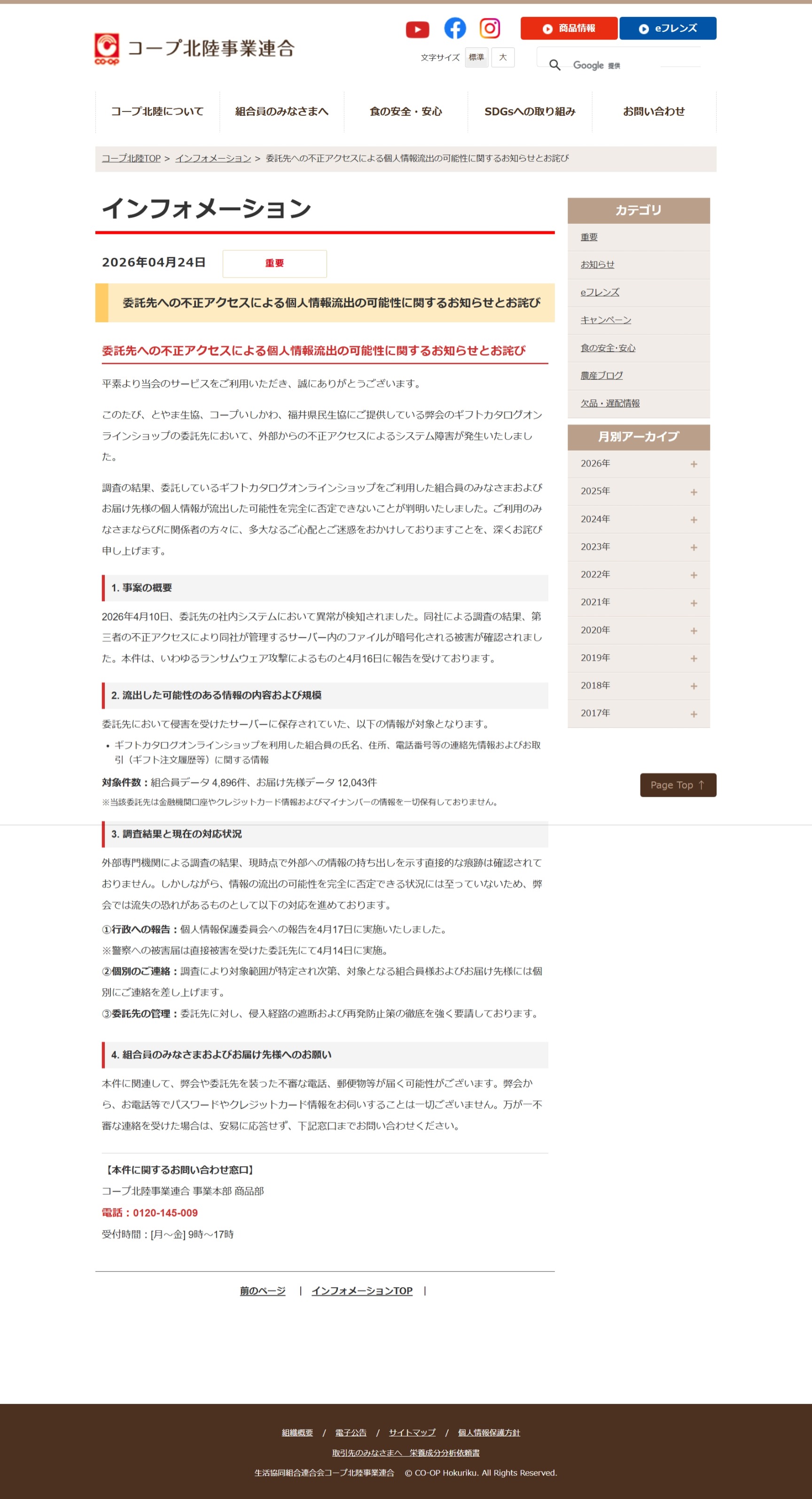 委託先への不正アクセスによる個人情報流出の可能性に関するお知らせとお詫び | コープ北陸事業連合