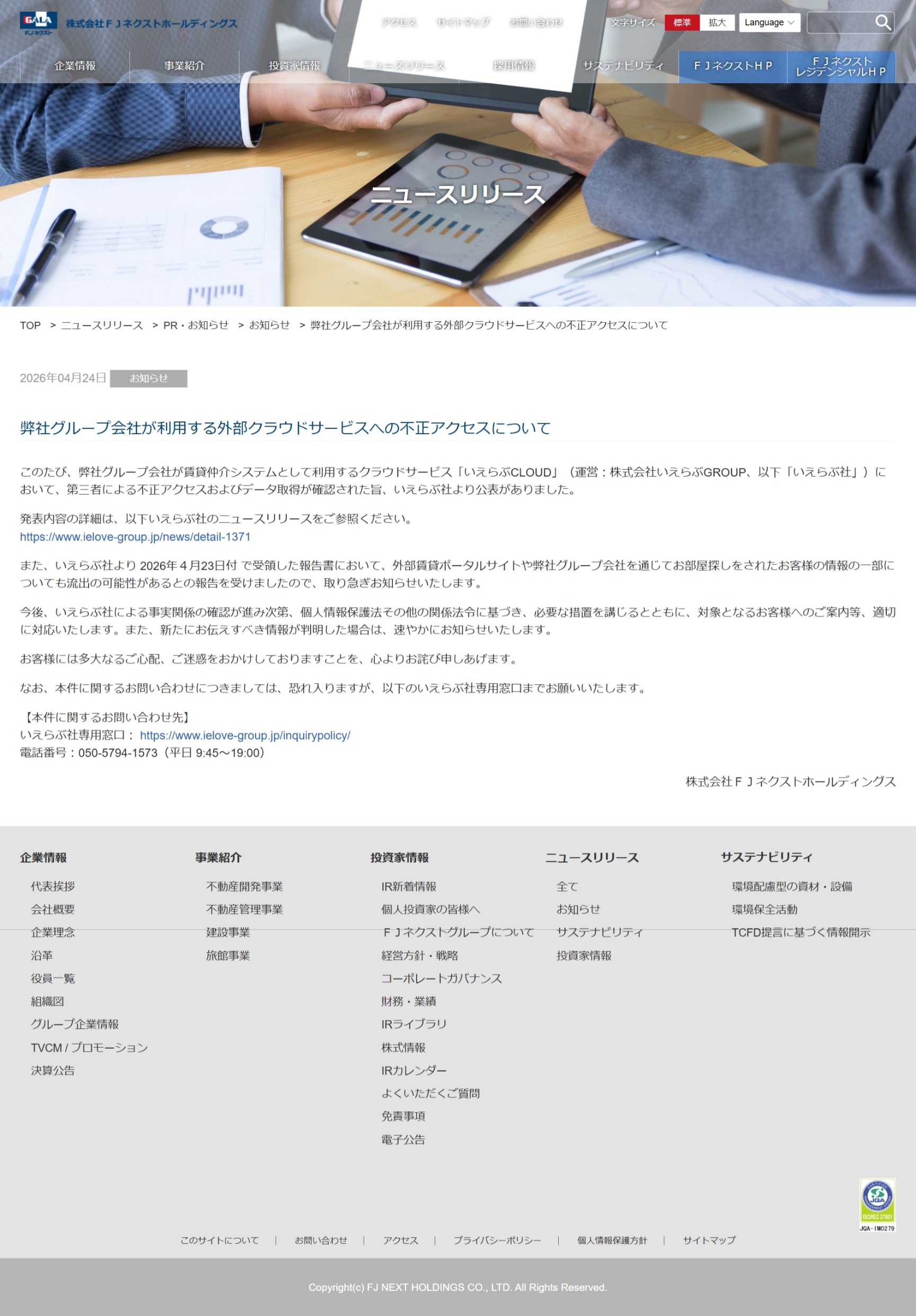 弊社グループ会社が賃貸仲介システムとして利用するクラウドサービス「いえらぶCLOUD」(運営:株式会社いえらぶGROUP)において、第三者による不正アクセスおよびデータ取得が確認された旨、いえらぶ社より公表がありました。いえらぶ社より 2026年4月23日付 で受領した報告書において、外部賃貸ポータルサイトや弊社グループ会社を通じてお部屋探しをされたお客様の情報の一部についても流出の可能性があるとの報告を受けましたので、取り急ぎお知らせいたします。あいおいニッセイ同和損保