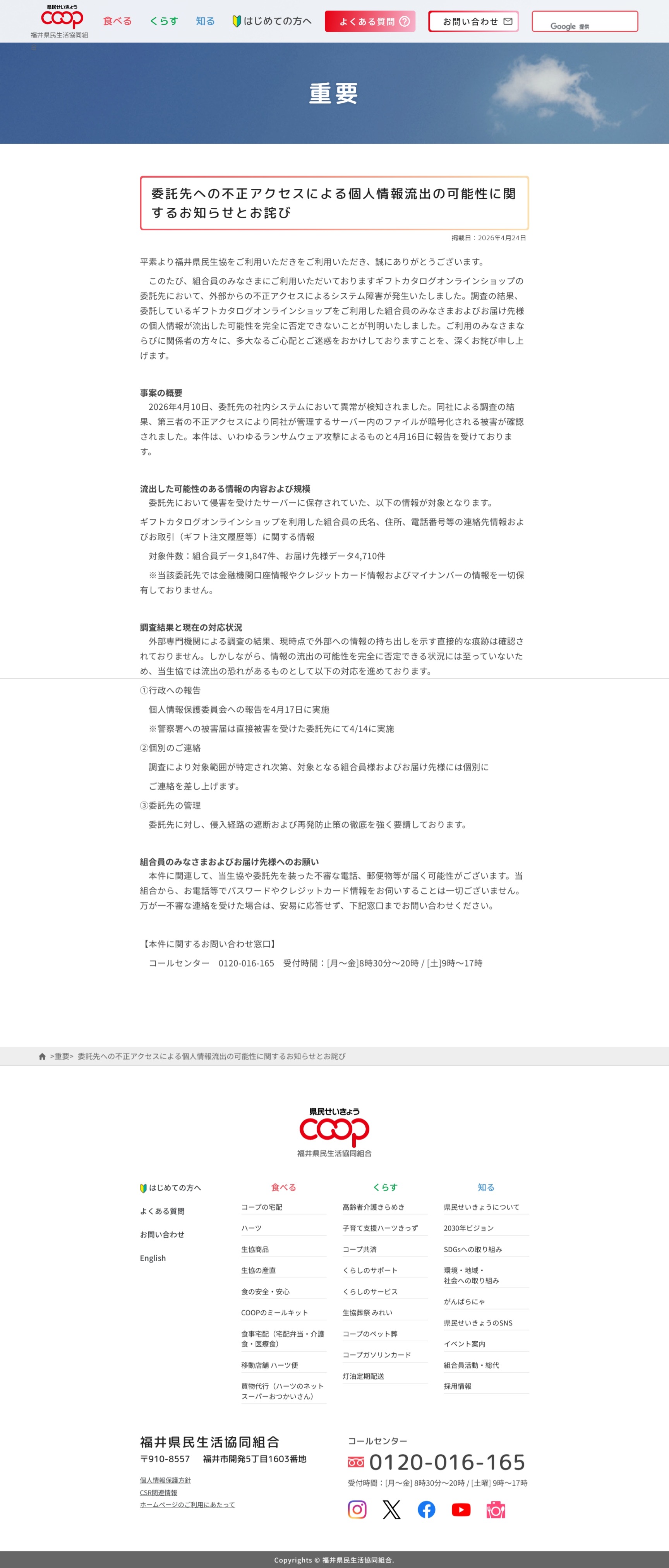 委託先への不正アクセスによる個人情報流出の可能性に関するお知らせとお詫び | 福井県民生活協同組合
