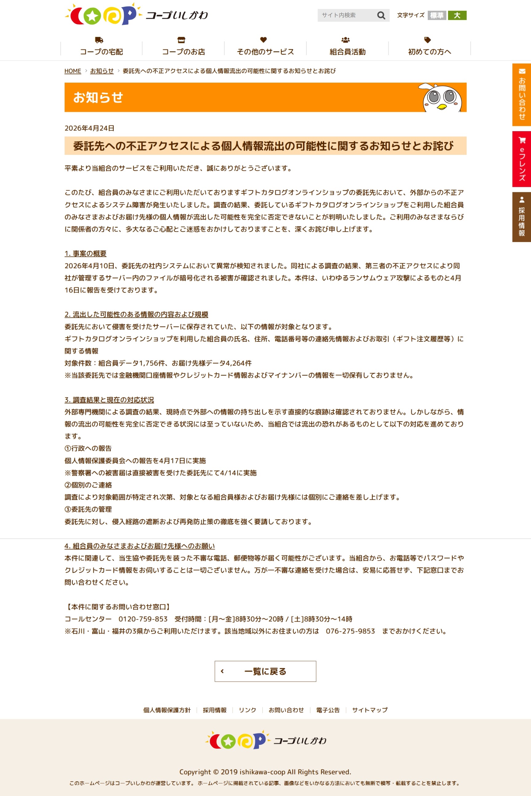 委託先への不正アクセスによる個人情報流出の可能性に関するお知らせとお詫び | 生活協同組合コープいしかわ