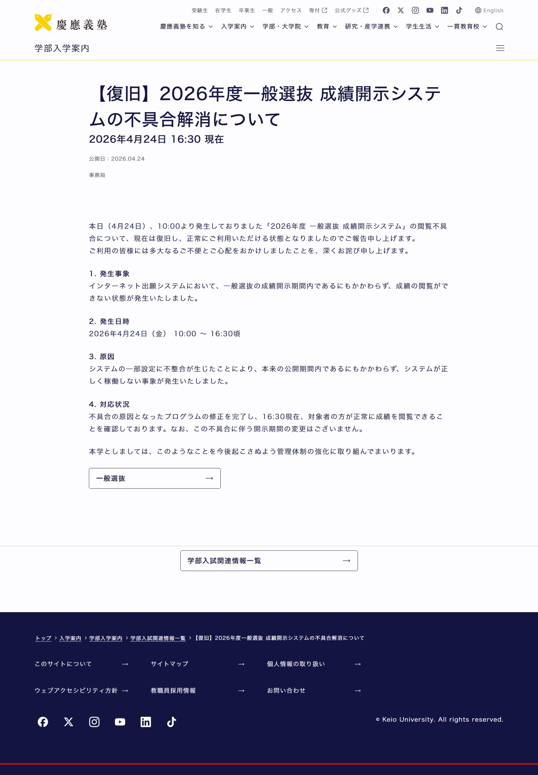 【復旧】2026年度一般選抜 成績開示システムの不具合解消について 2026年4月24日 16:30 現在