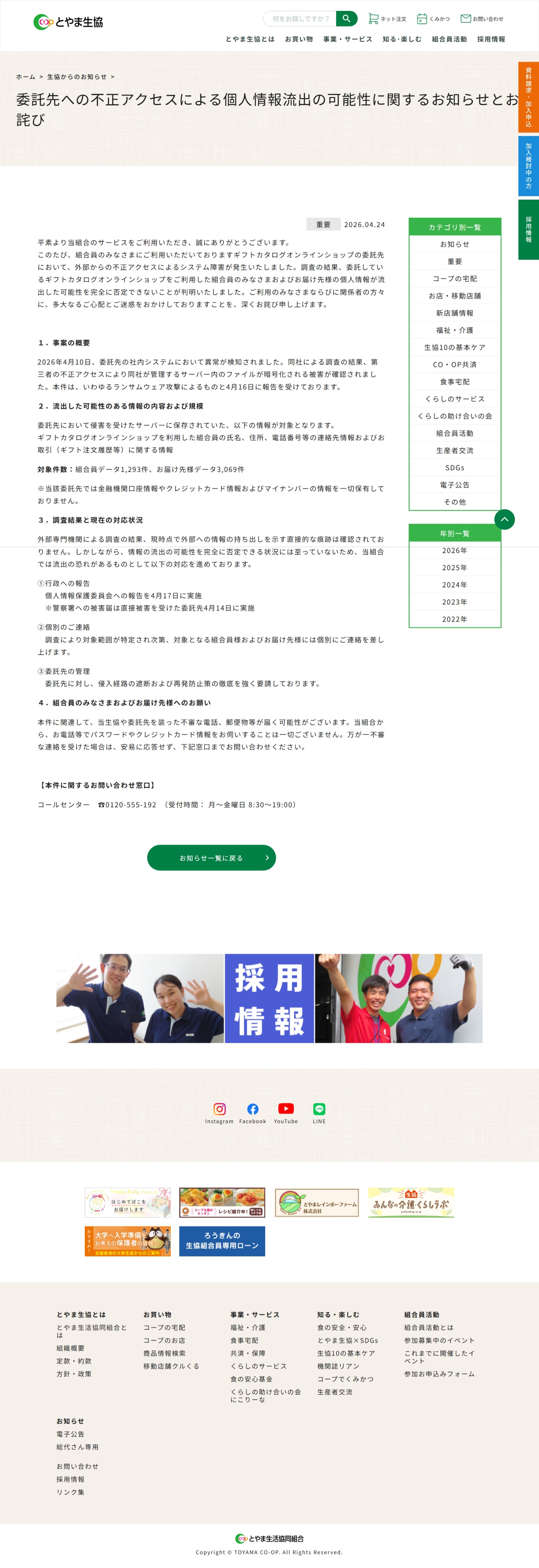 委託先への不正アクセスによる個人情報流出の可能性に関するお知らせとお詫び | とやま生活協同組合